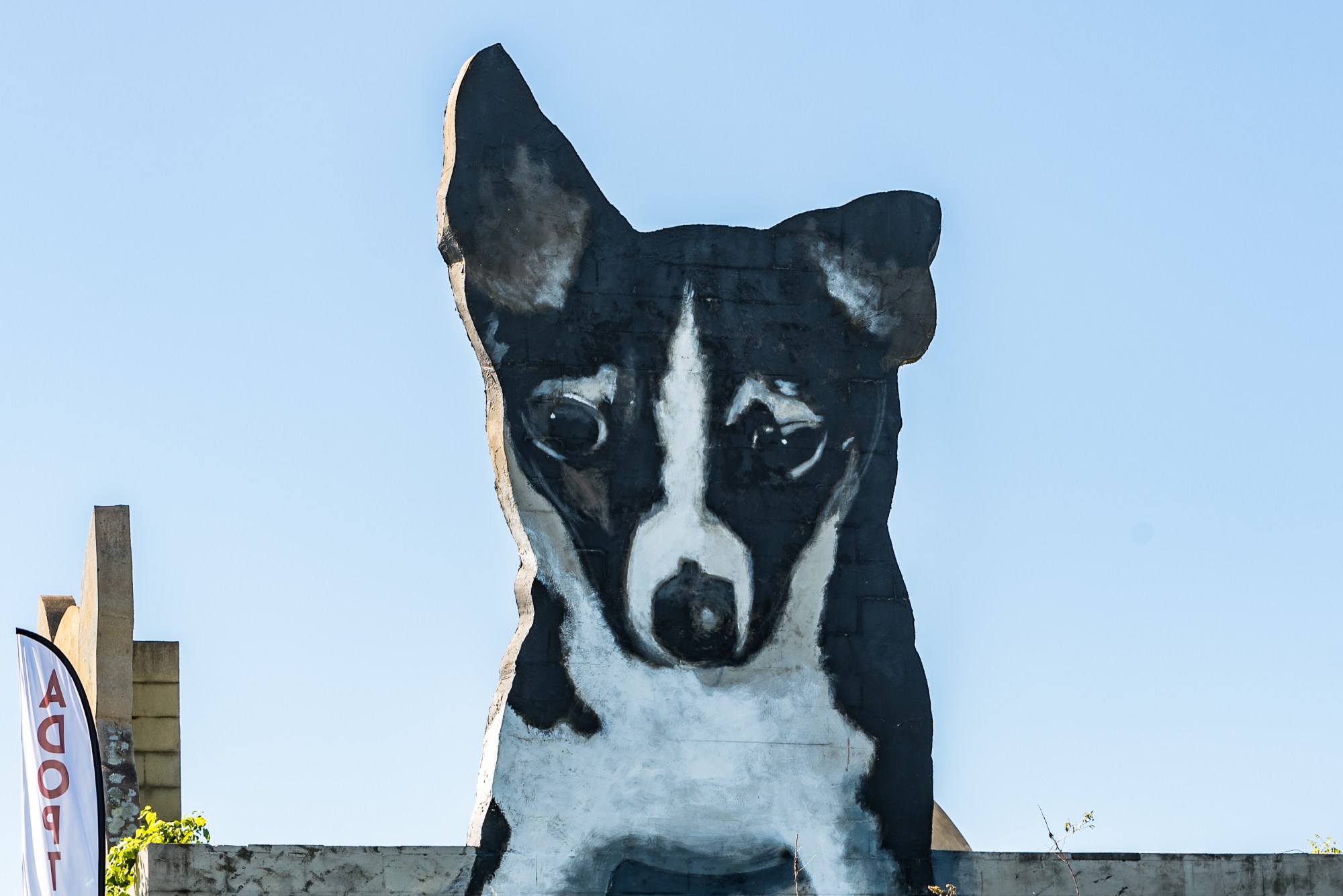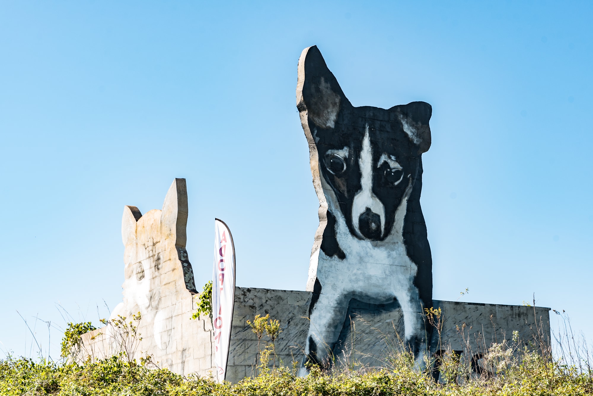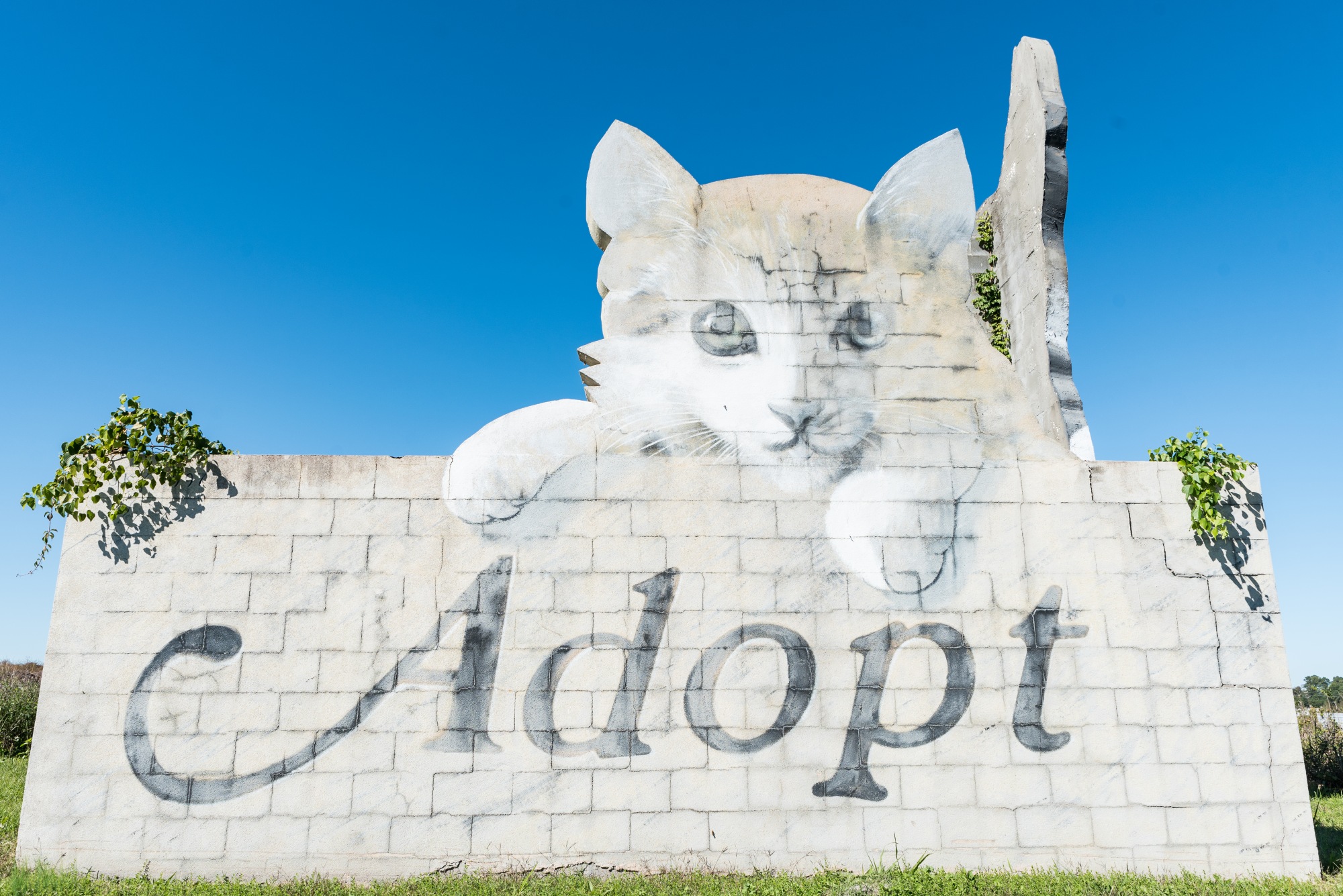 Completed in February 1999, the mural/sculptural piece features a gray and white cat and a black puppy. The mural was completed in conjunction with the ground-breaking of the new City of Columbia pet adoption center.