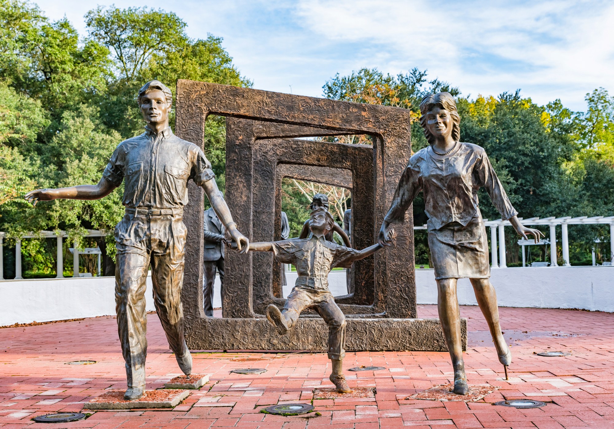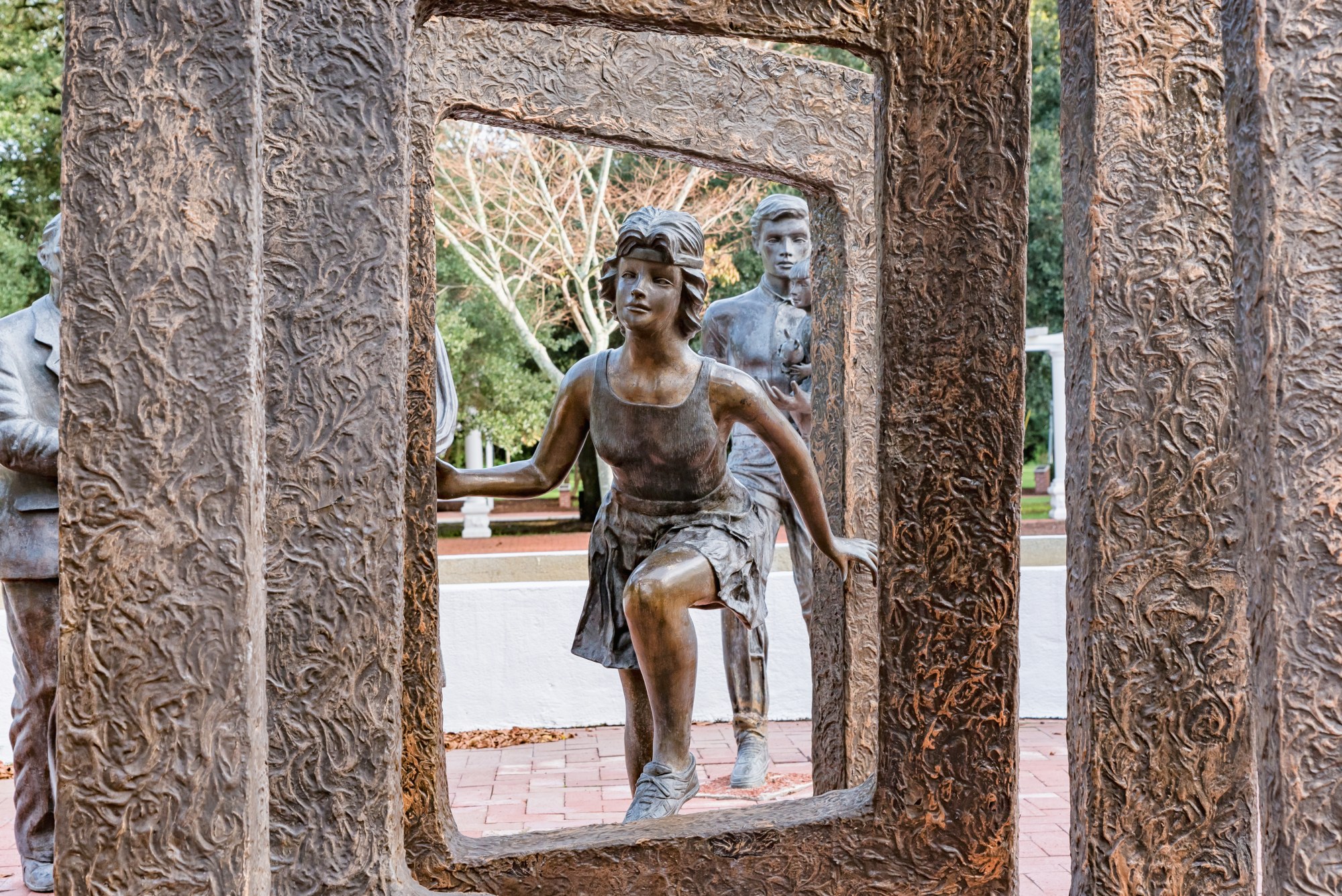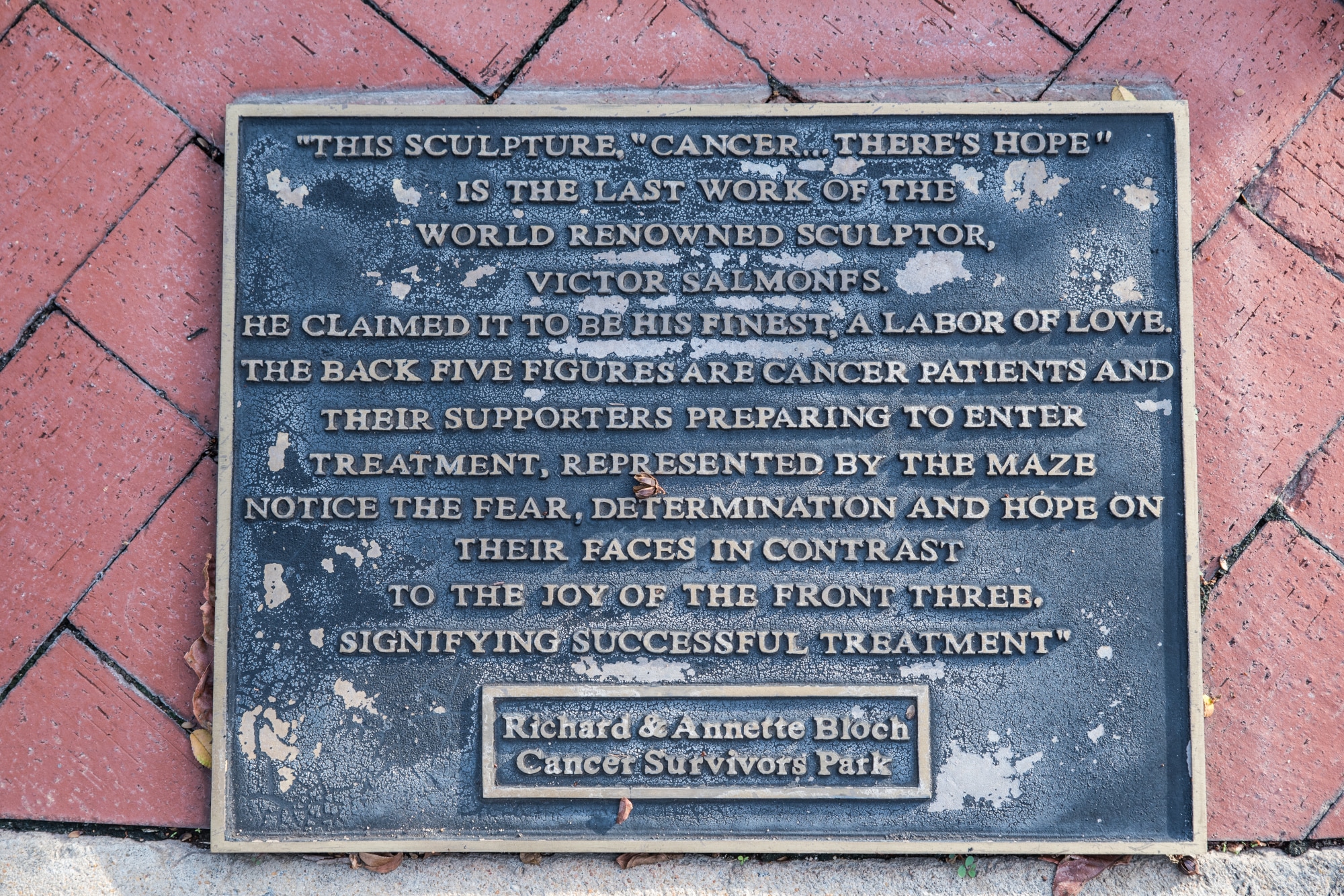 These bronze sculptures, located within the Richard & Annette Bloch Cancer Survivor’s Garden within Maxcy Gregg Park, are the last work of Victor Salmones and are located at each of the 25 Bloch Cancer Survivor parks. The sculptures and bronze plaques were part of a grant from the Richard and Annette Bloch Cancer Foundation. This piece features figures representing cancer patients and their supporters, preparing them for treatment. The monument celebrates survivors of all ages who have defeated cancer.