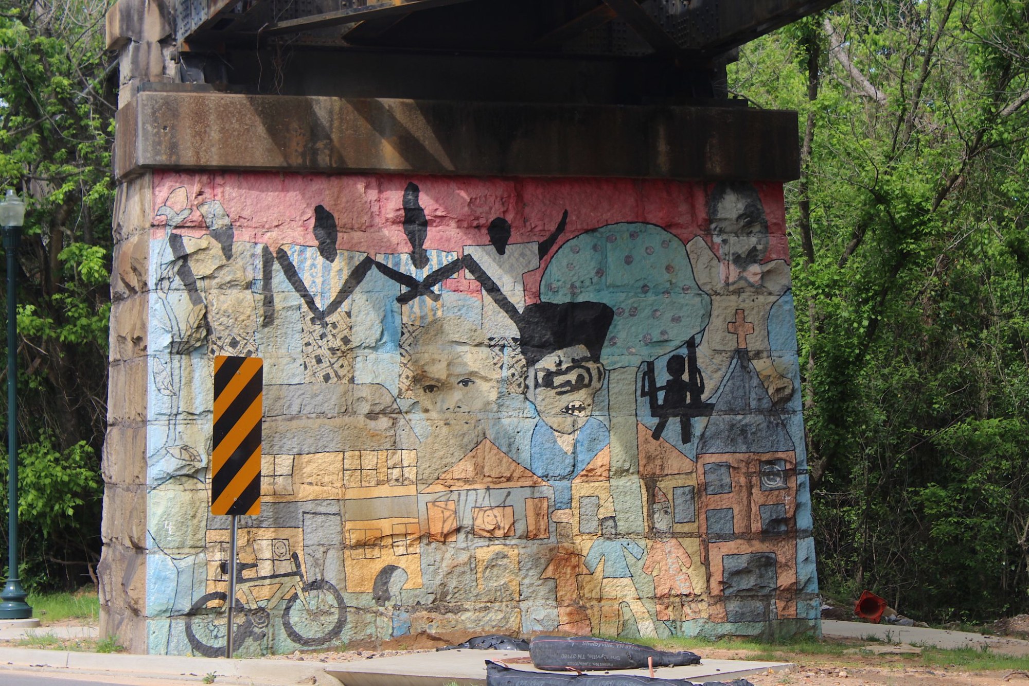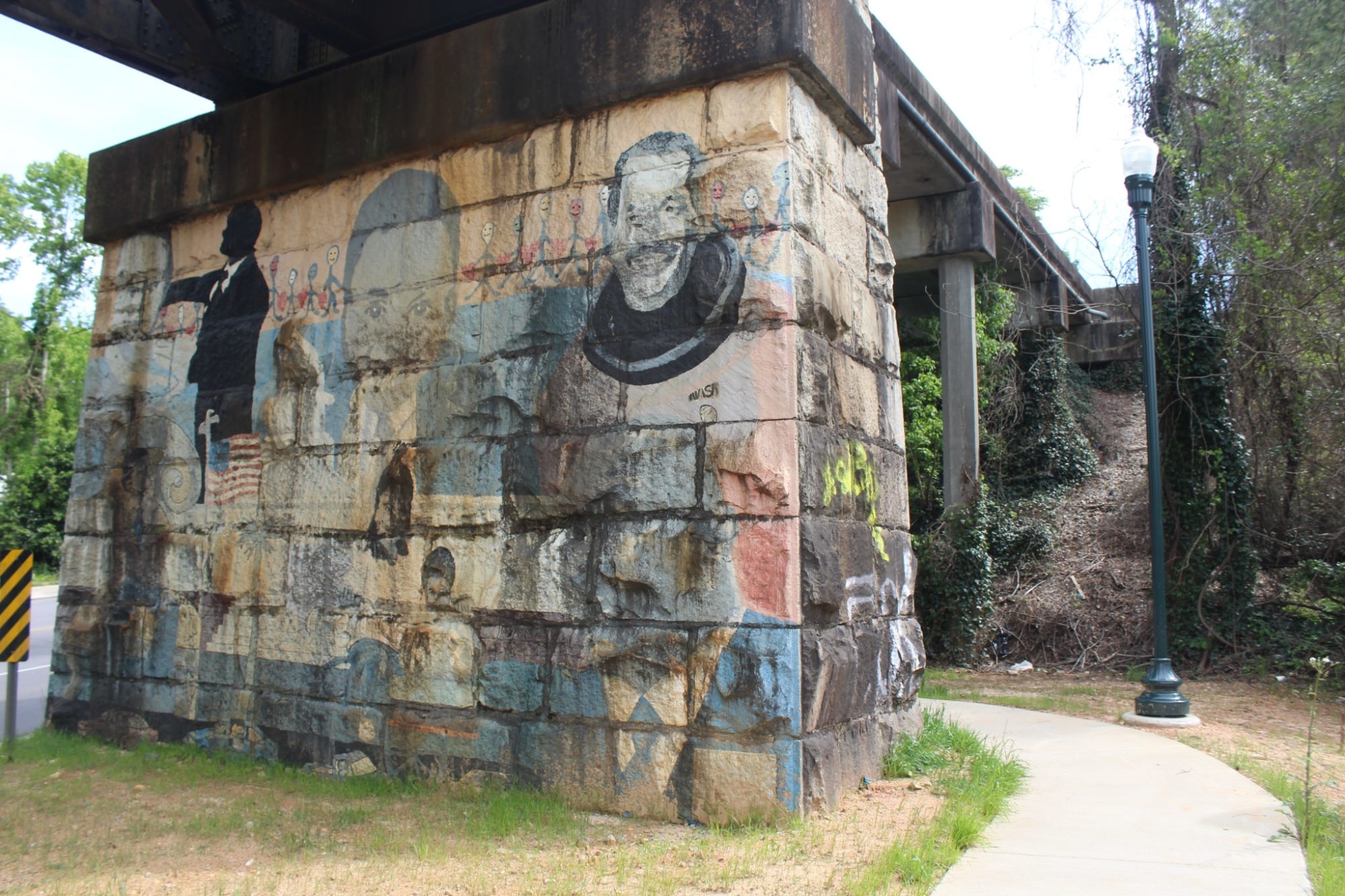 It’s painted on both supports of a North Main Street railroad trestle at the entrance to Earlewood Park. Waldrop had help with this mural from artist Vanessa Ashford– Bussy.