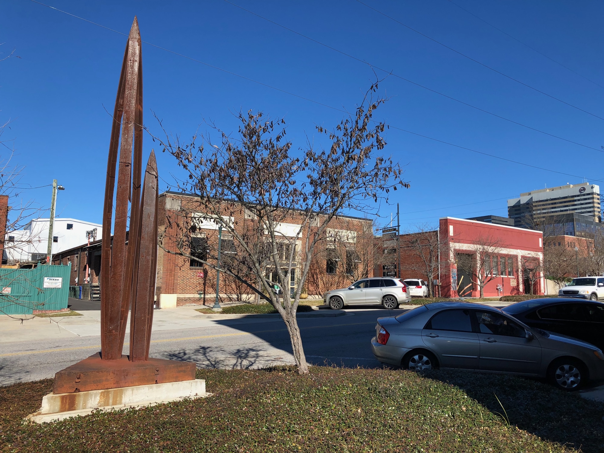 “It alludes to my upbringing in Virginia Beach,” says artist Stephen Chesley, describing the sculpture’s nautical elements: a triangular base that suggests the prow of a ship and an interior steel wind chime tuned to the pitch of a fog bell. “It takes a bit of wind to get it going. When we have a good wind, it will suggest the ocean with the fog bell tonality. Also, it’s located near the City Art building. The plantings that the city did are an integral part of it. It will sit between two trees, one of them a cypress, which is a water tree.”