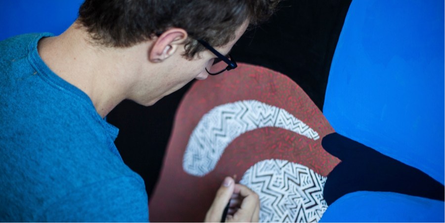 Based around the most ubiquitous symbols of South Carolina: the palmetto and the crescent moon which adorn the State’s flag, the mural depicts a Carolina Wren (the state bird of South Carolina) perched on a palmetto branch shaded with the compliments dark blue and yellow. Rendered in the artist’s distinct pattern-based style, which adds depth and complexity to the image, the mural represents the passage of time and the tenacity of the human spirit. The central moon is a symbol for the utopian future of the wren, a metaphor for humanity and optimism, while the smaller moons show the days and time that separate the present from that goal. Overall it is an image that is both representative of South Carolina and inspires those who view it with the endless possibilities of a hopeful future.