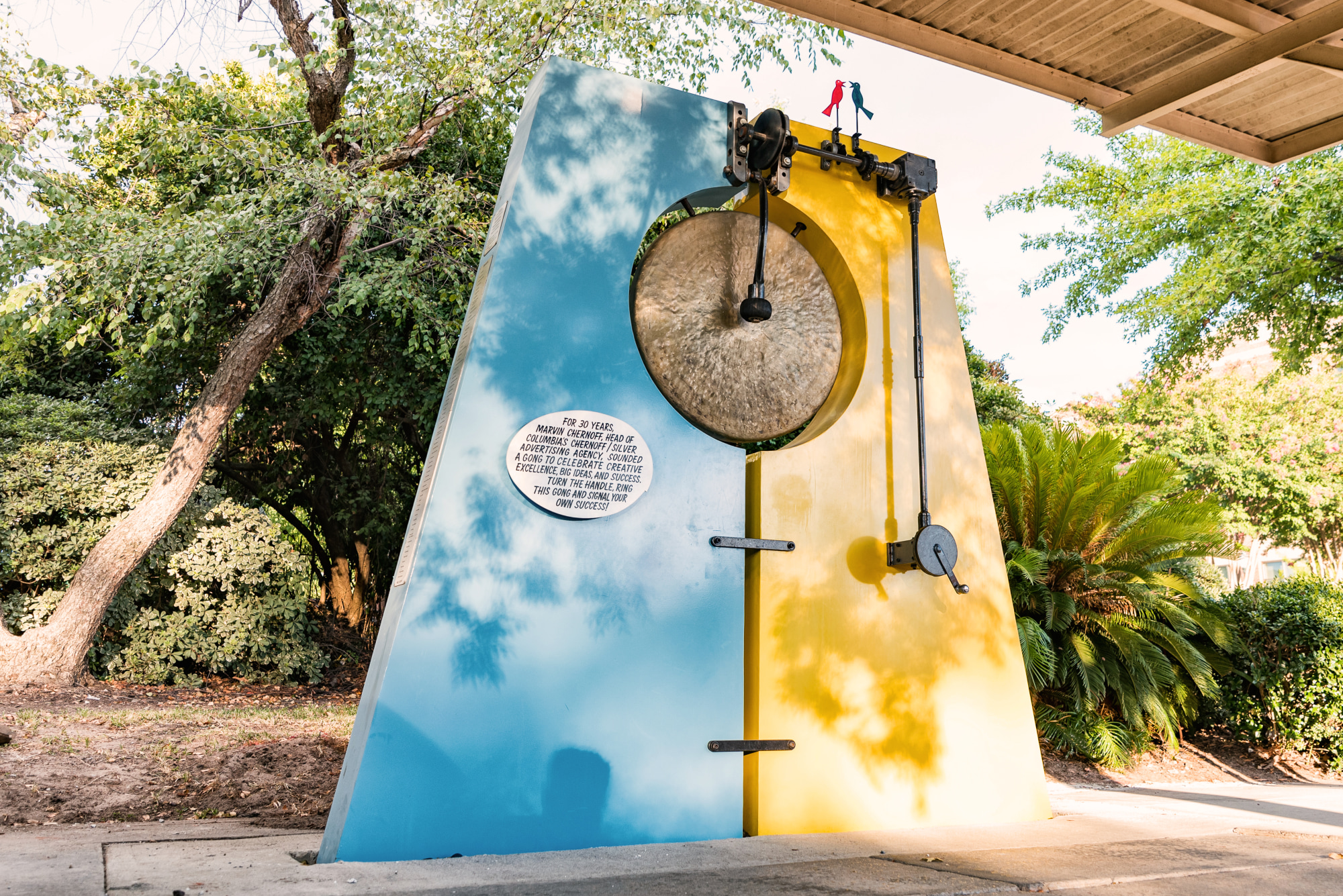 The “Gong” is a commemorative piece created to celebrate the late Marvin Chernoff, a legendary Public Relations Guru and the founder of Chernoff Newman. The sculpture consists of an 8ft by 8ft gong anchored in the ground, with a winding crank to strike the mallet to the gong. Gonging was the way Marvin symbolized a job well done, and as a way to create closure while moving forward to the next project. As former employee, longtime friend, and One Columbia board member Lee Ann Kornegay states, “When Marvin said ‘Gong!’ you knew it was time to take the idea and get started. It was his approval of either the right direction or a way to let you know the discussion was over. He was wonderful at recognizing when something fit and then taking action on it.”