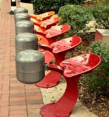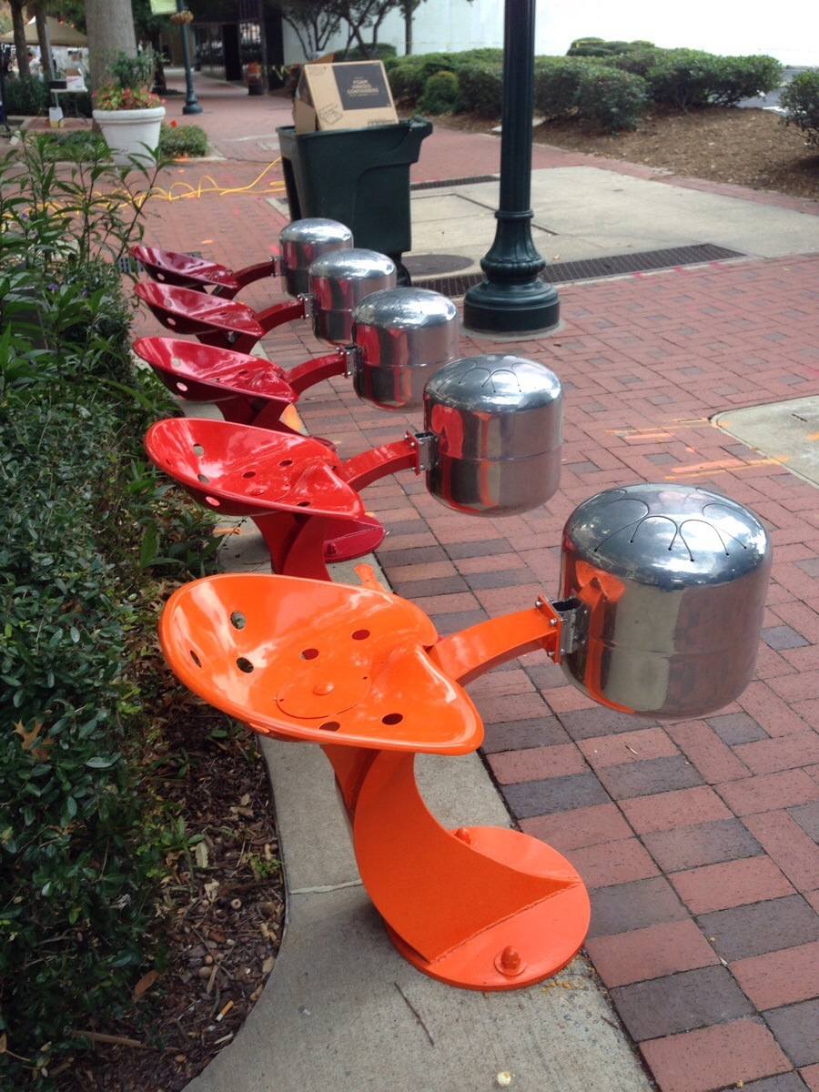 “Hanging is an invitation to play…to stop and sit and play, or just listen. The sculpture takes the form of five arranged hand drums with seats for users to straddle the drum. Drums are played by tapping on the different areas of the surface. Artists Eileen Blyth and Mark Finley were commissioned by Drip on Main to create a piece that was both interactive and musical, and this piece was the result. It is composed of five individual benches made of tractor seats, with hand drums attached to the base, and when played, the drums all have their own individual tones. They can be played by any passerby at any time.”