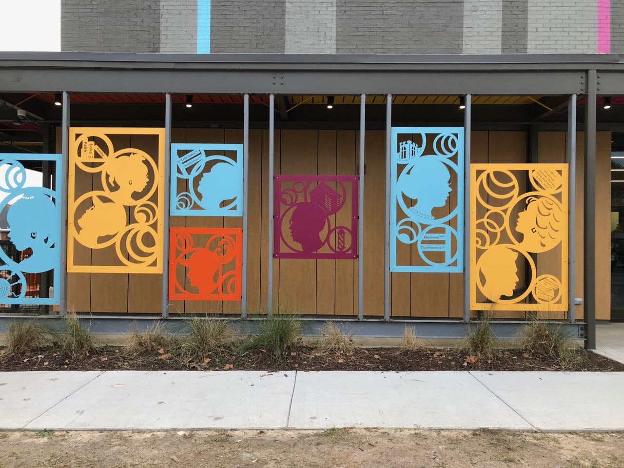 In this artwork, titled “Neighborhood Treasures,” the artist created seven panels that reflect the pride in the community, history and people of Edgewood. The people depicted on the panels were done in silhouette so they could represent all members of the community. Beloved landmarks and symbols of daily life were added as well as a few of the many inspirational comments about the neighborhood.