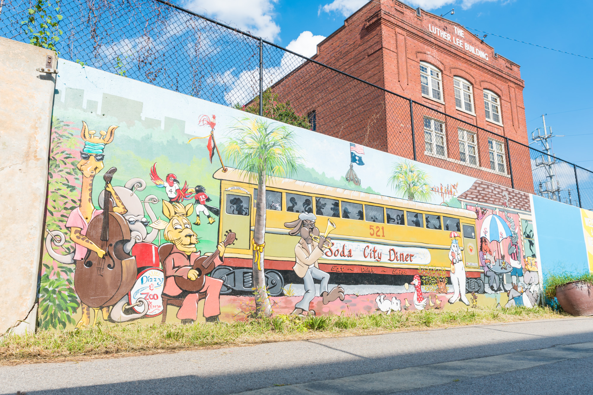 On a beautiful Soda City afternoon, the whole community gathers around to hear the sounds of the Dizzy and the Boys animal band as they perform outside a Seaboard Air Line passenger car converted into a diner. The mural celebrates the unity and sense of community that brought people together to rebuild the city – Columbia after the flood.