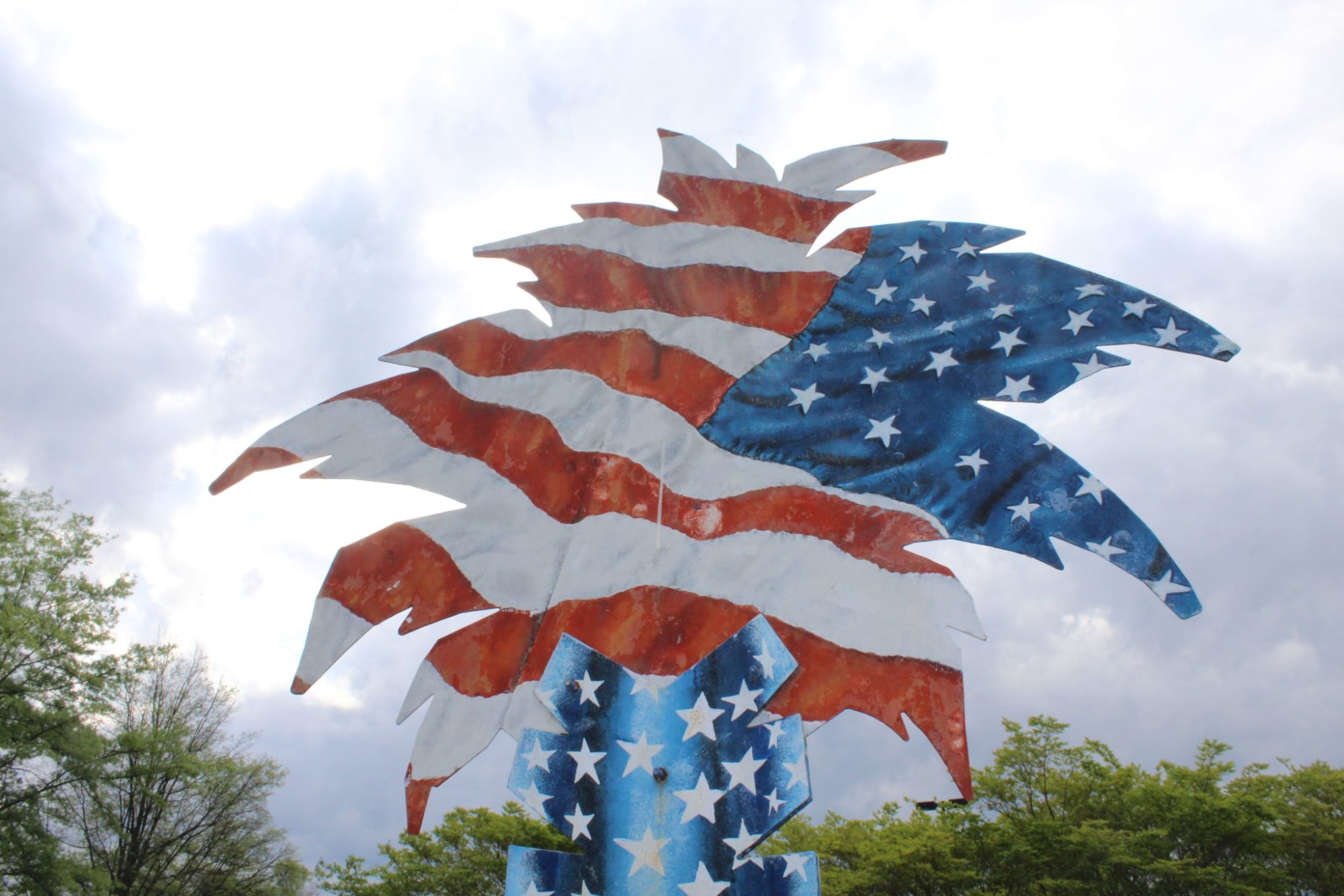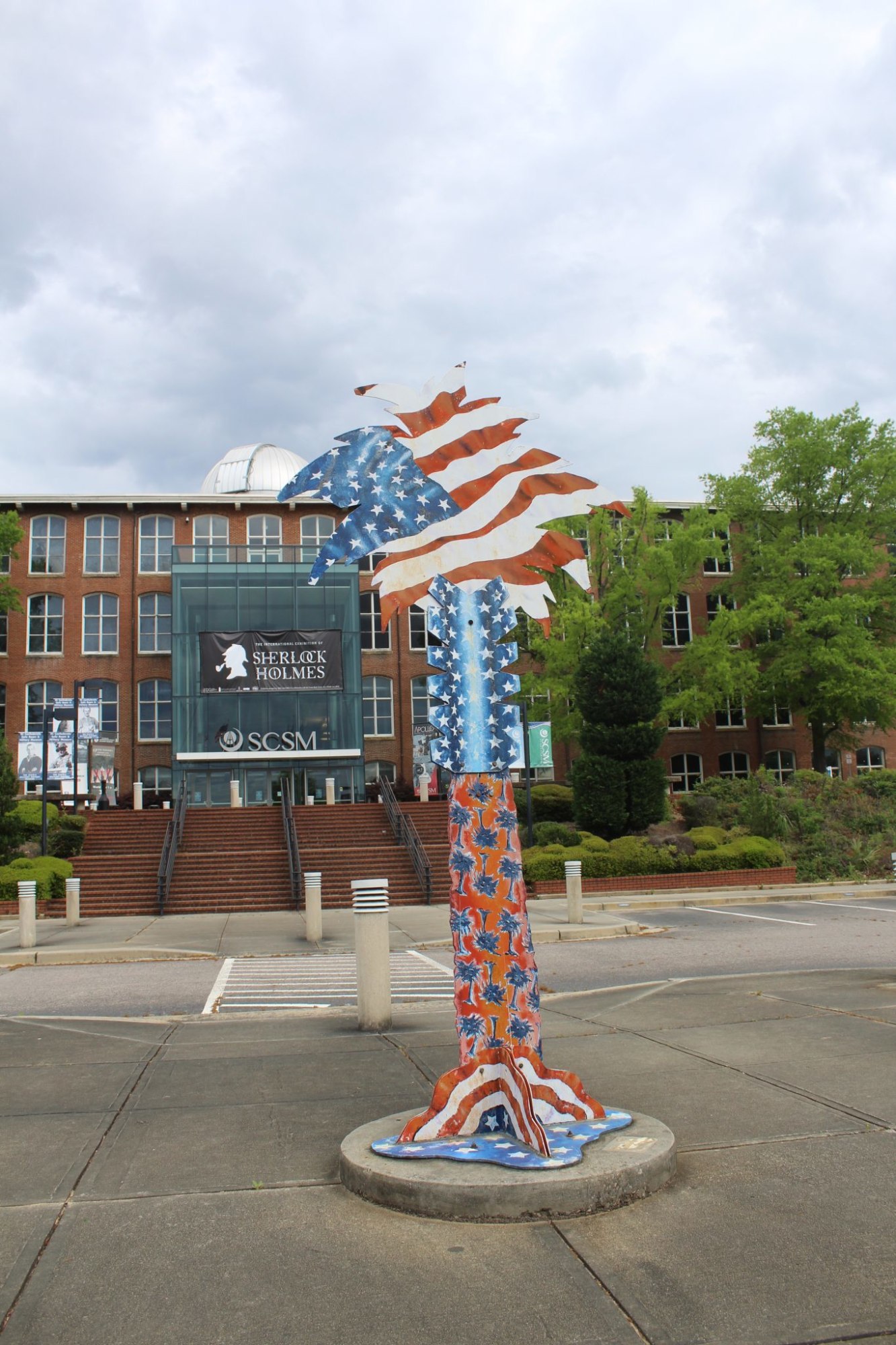 As part of the Palmetto Tree Project, this tree sculpture is patterned after the American Flag and SC State Flag. It was installed by the Cultural Council and dedicated by Governor Jim Hodges, Honors SC Fire, SCPD, and SC Emergency Personnel in 2002.