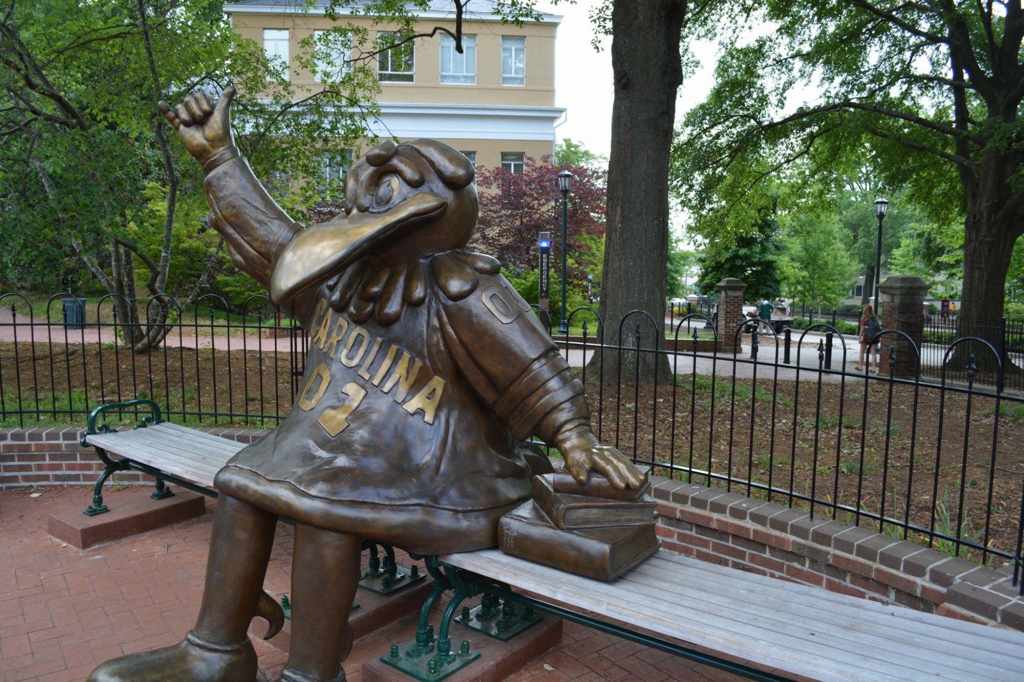 The sculpture is created by USC alumni, Robert Allison, featuring Cocky sitting next to a stack of books while his right hand makes the “spur” hand signal seen at USC sporting events. The area near Melton Observatory was chosen as the statue’s home because its trees and red-brick pathways offer a scenic backdrop for photos.