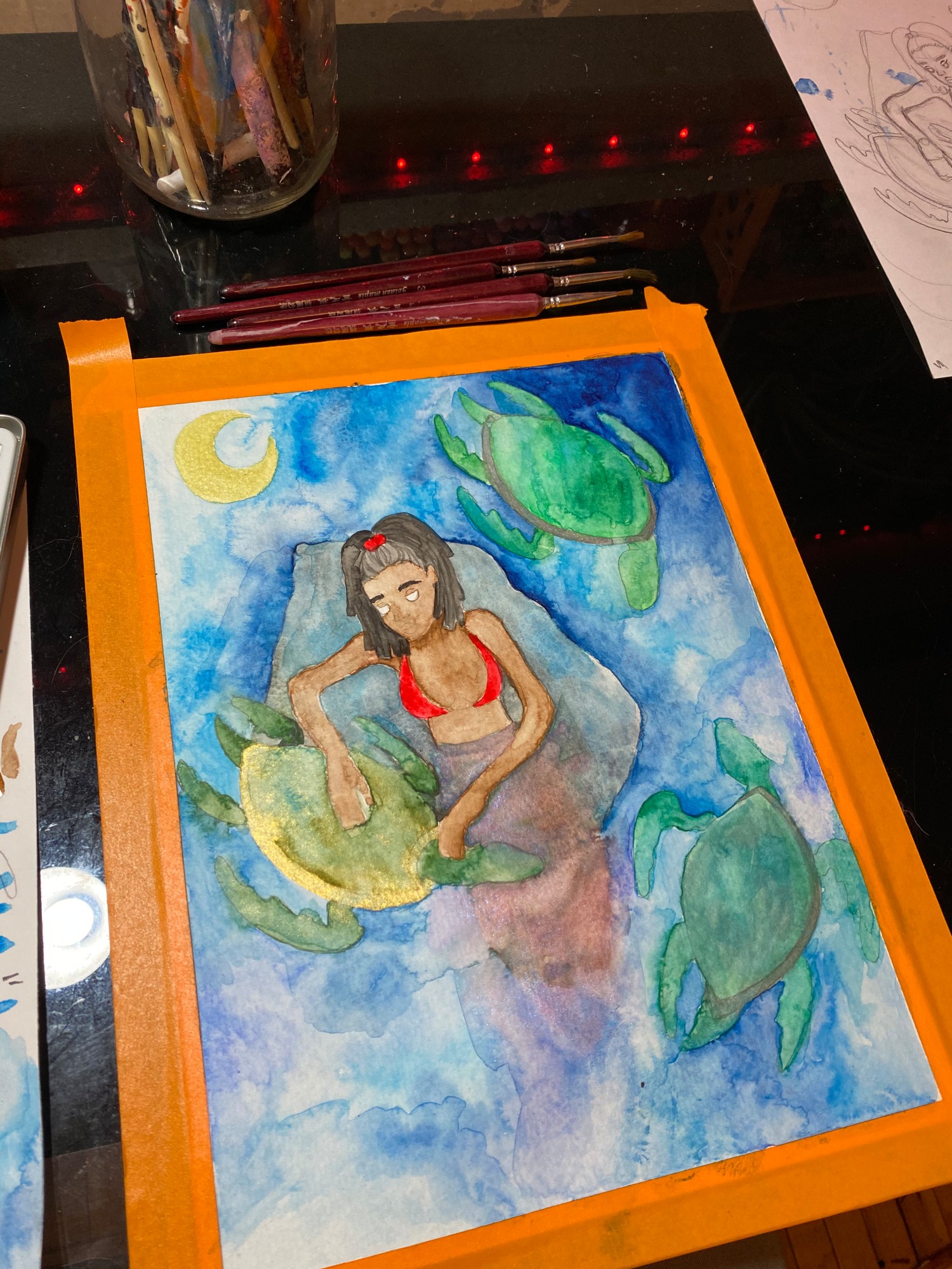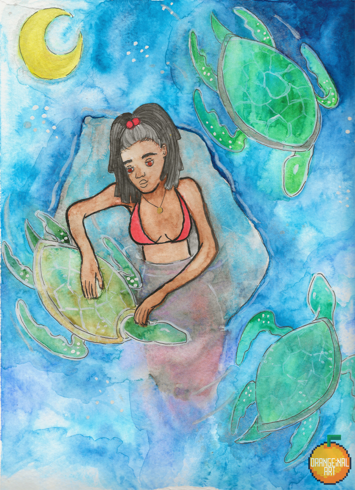 I made this piece using micron pen and watercolour, keeping the lines loose and the colours soft so the scene feels light and fluid. The water and turtles move around the figure naturally, without drama, just existing together in the same space.
