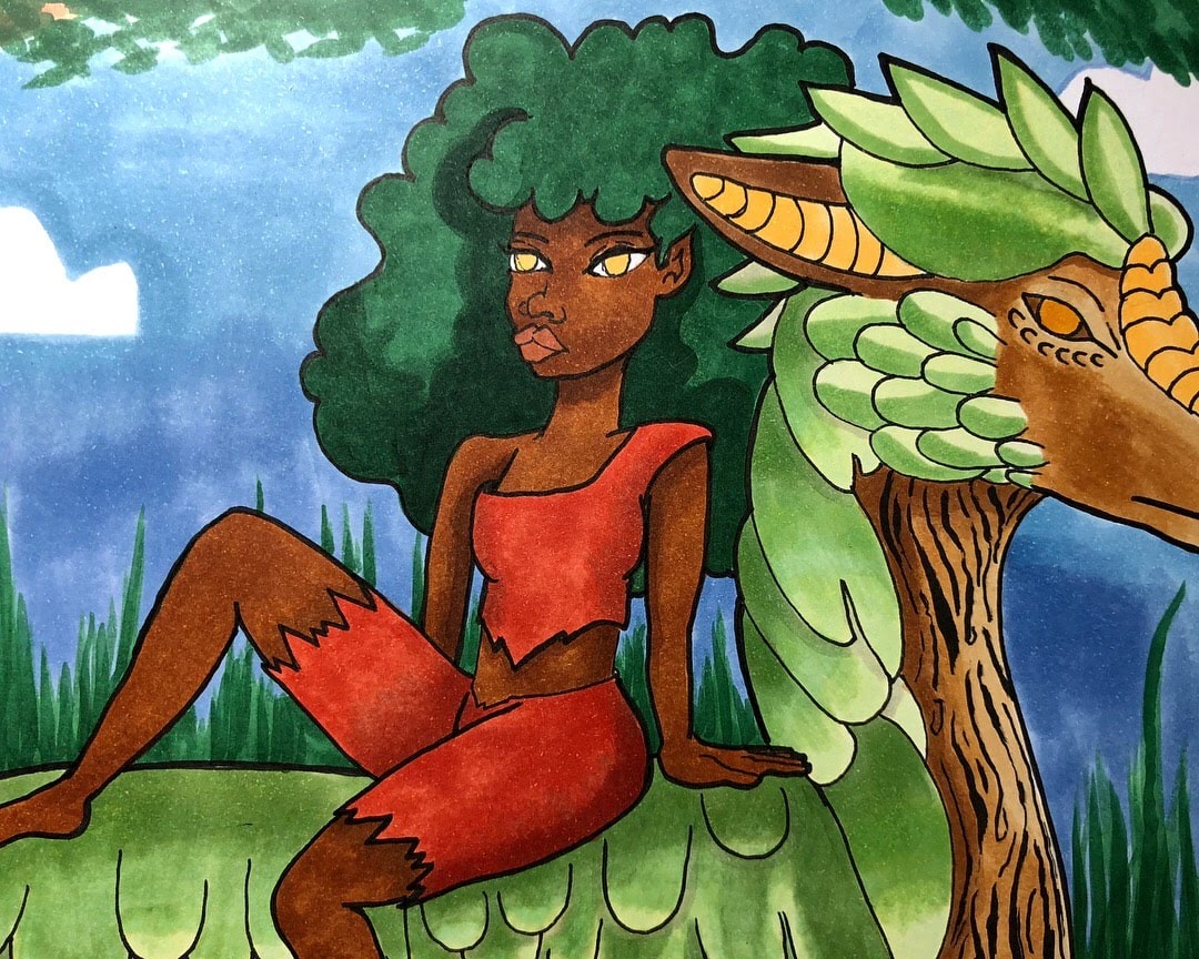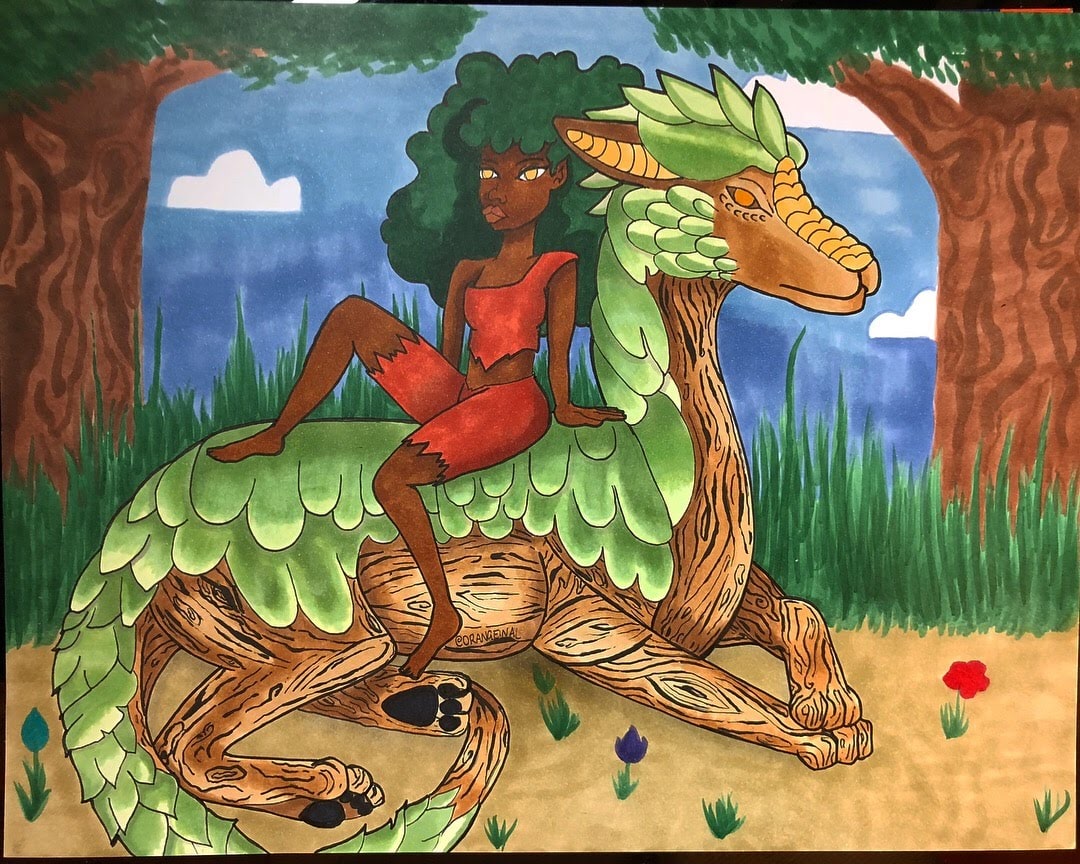 Using micron pens and Copic markers, I set out to bring this fantastical creature to life on paper. One of the most enjoyable aspects of creating this piece was experimenting with blending techniques, shading, and texture. I wanted to capture the intricate details of the dragon's wooden skin, so I spent extra time perfecting the shading and adding texture to give it a lifelike appearance.