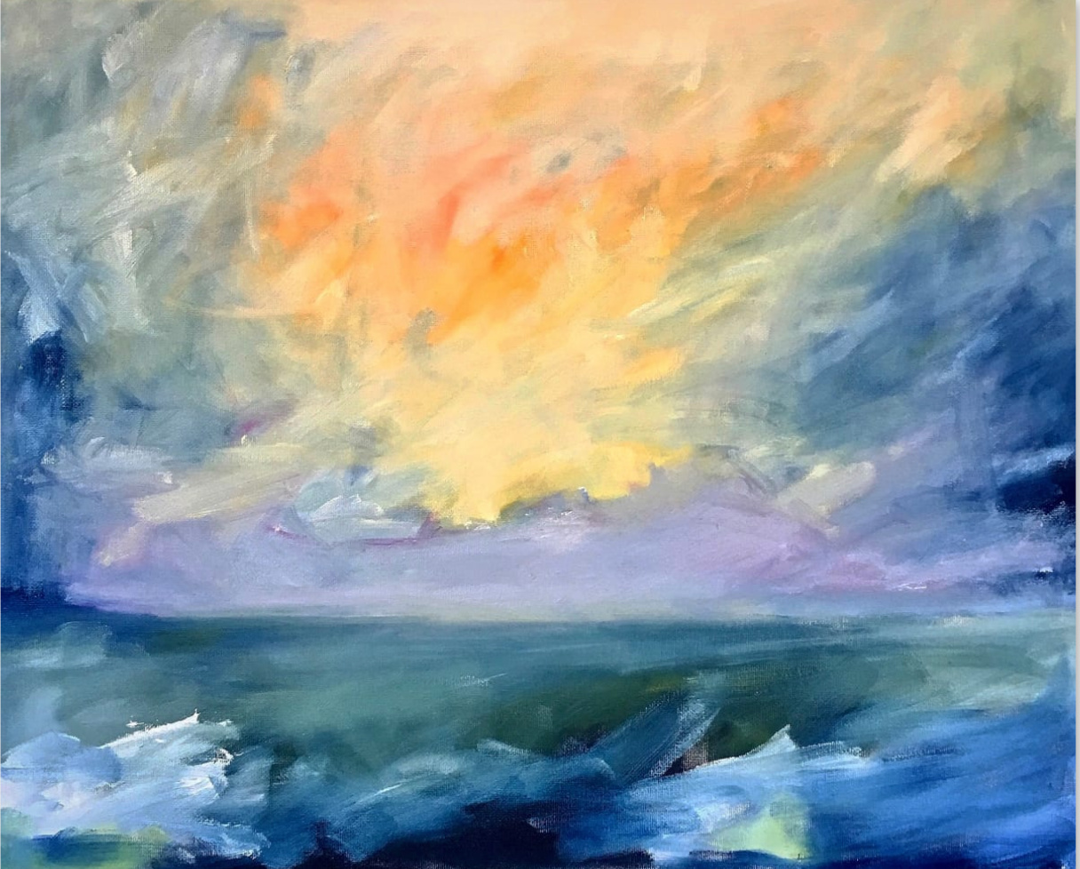 The soft brushstrokes, vibrant golden sky, and deep ocean hues give off a serene yet emotional transition—like the quiet moment when night becomes day.