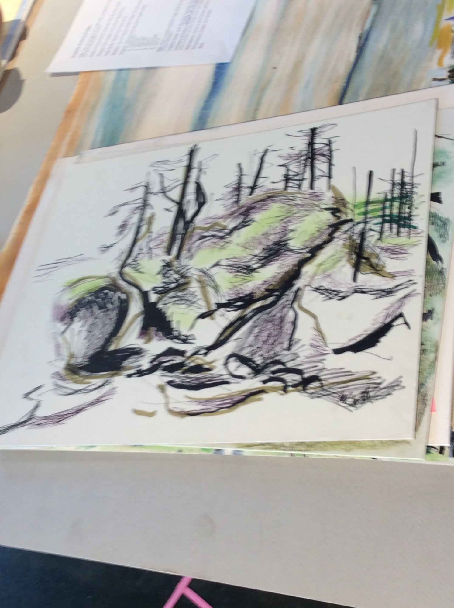 Crescent Beach Island, as written on back. Black ink tree trunk forms with ink low foliage and black ink definitions.