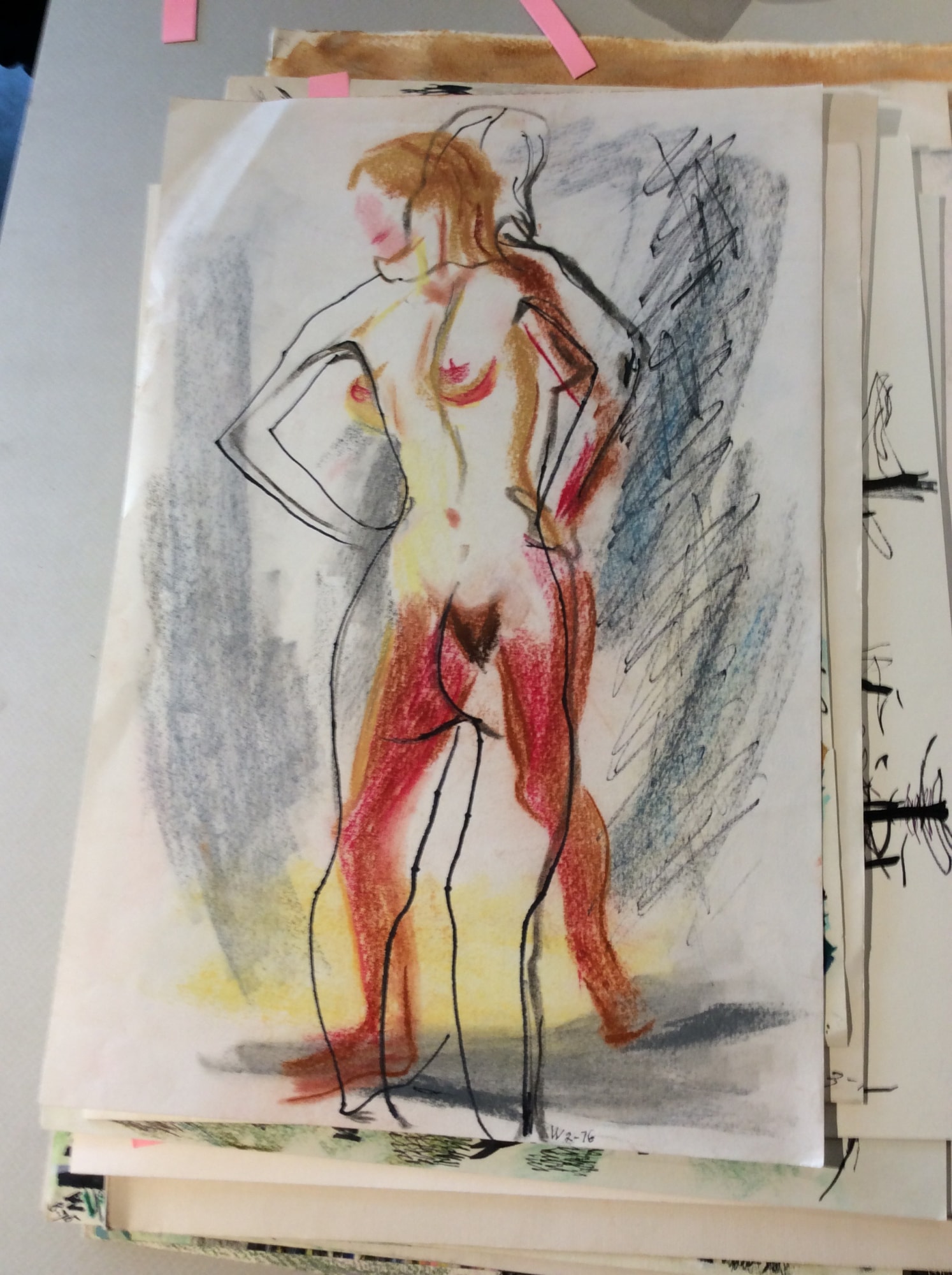 Standing nude model. Front in pastel, back in pen ink, superimposed upon eachother.