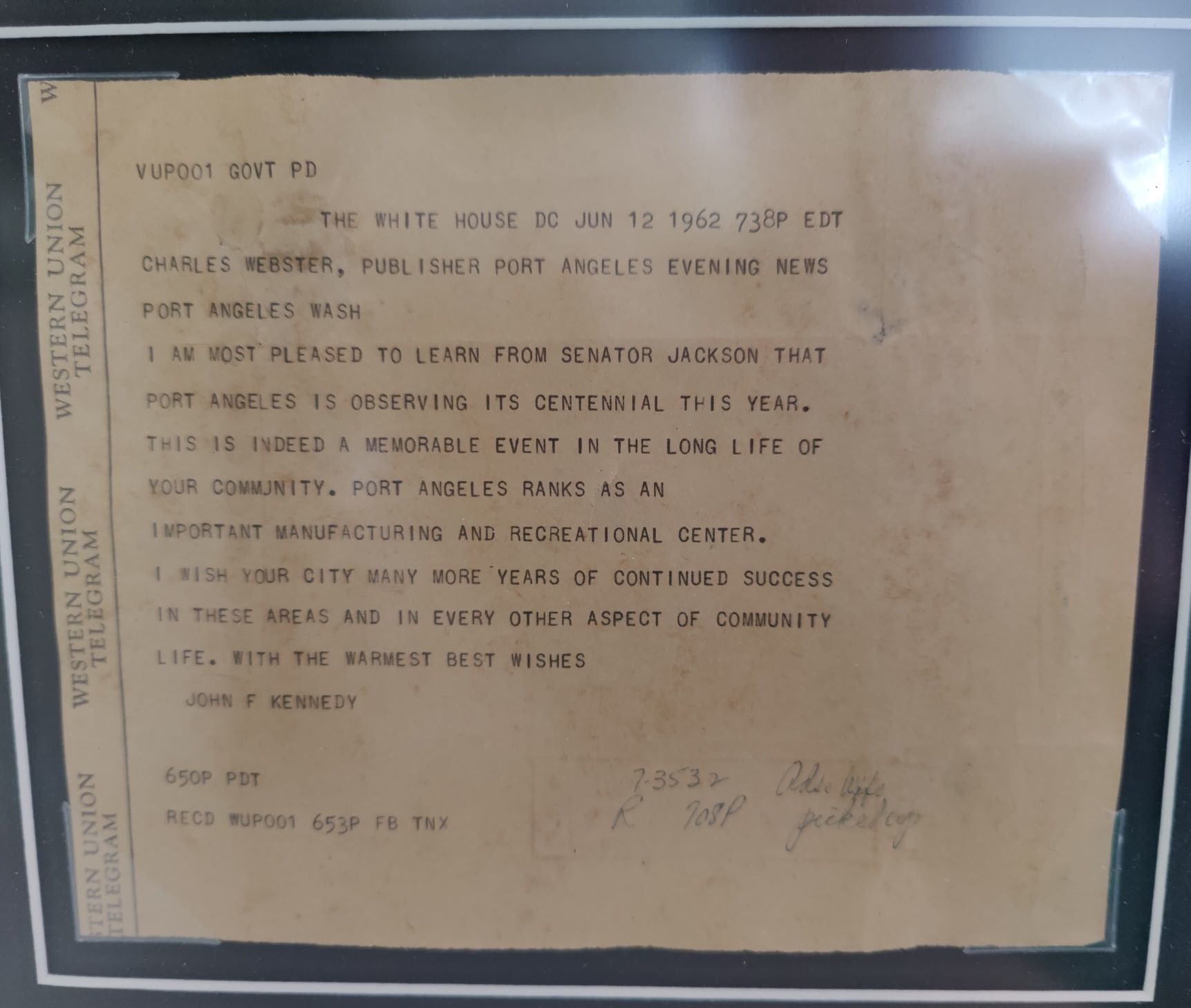 Framed telegram from President John F. Kennedy to Charles Webster in commemoration of Port Angeles' centennial.
