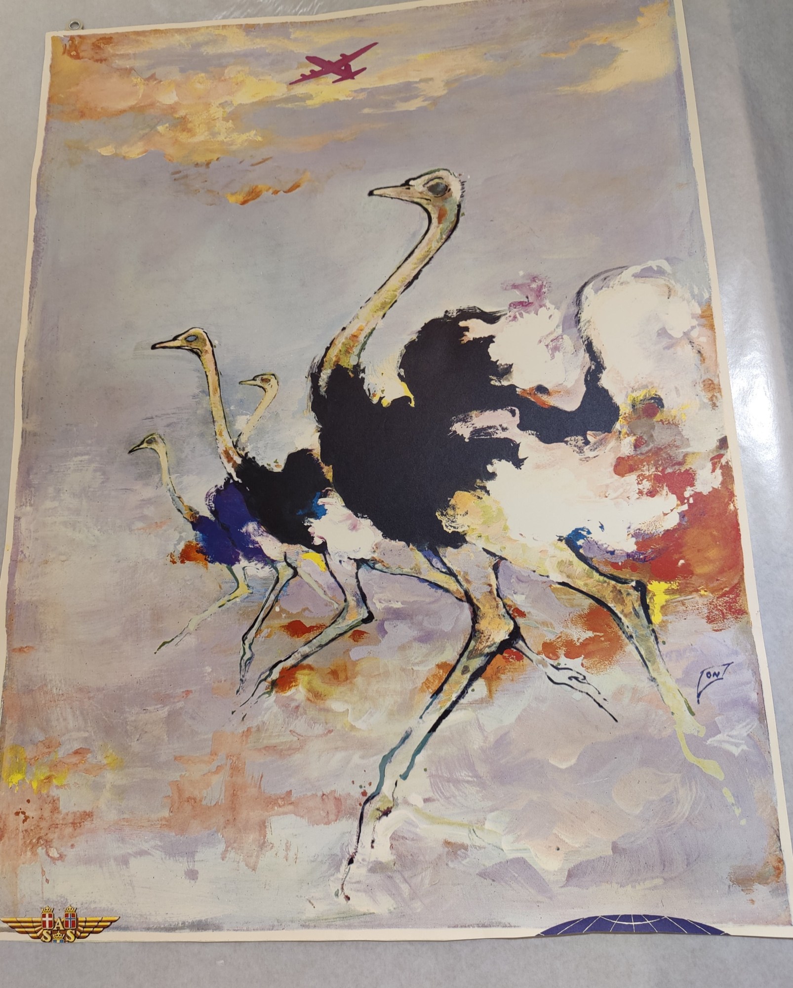 Four travel posters that have been cut in half, airline and route information has been cut off.