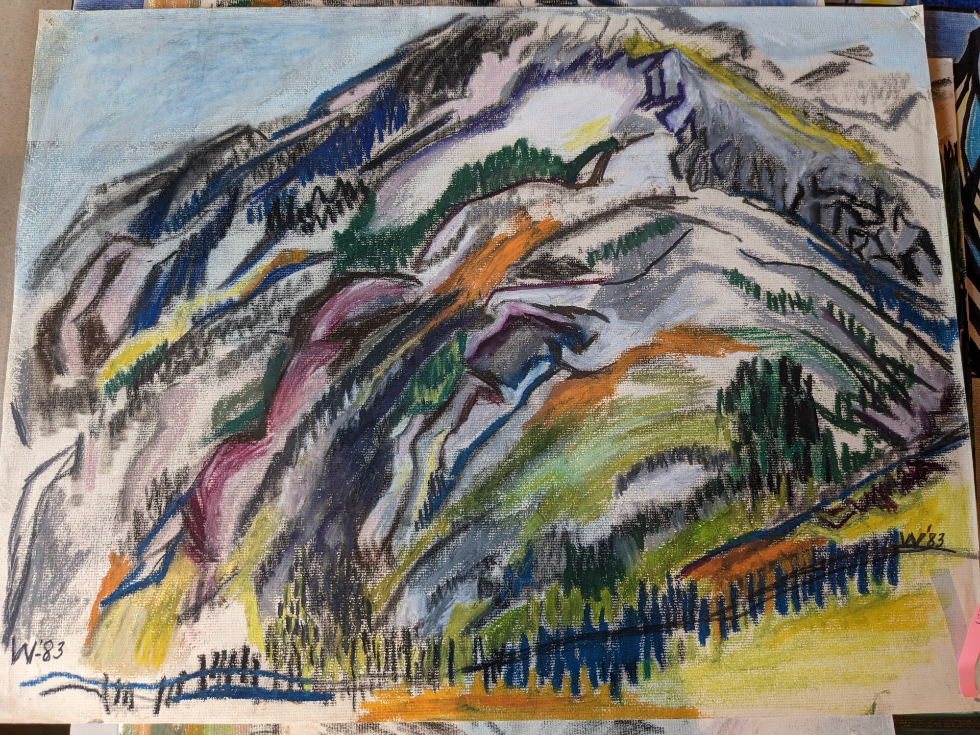Mountain hillside with black rocks, green trees and orange and purple highlights