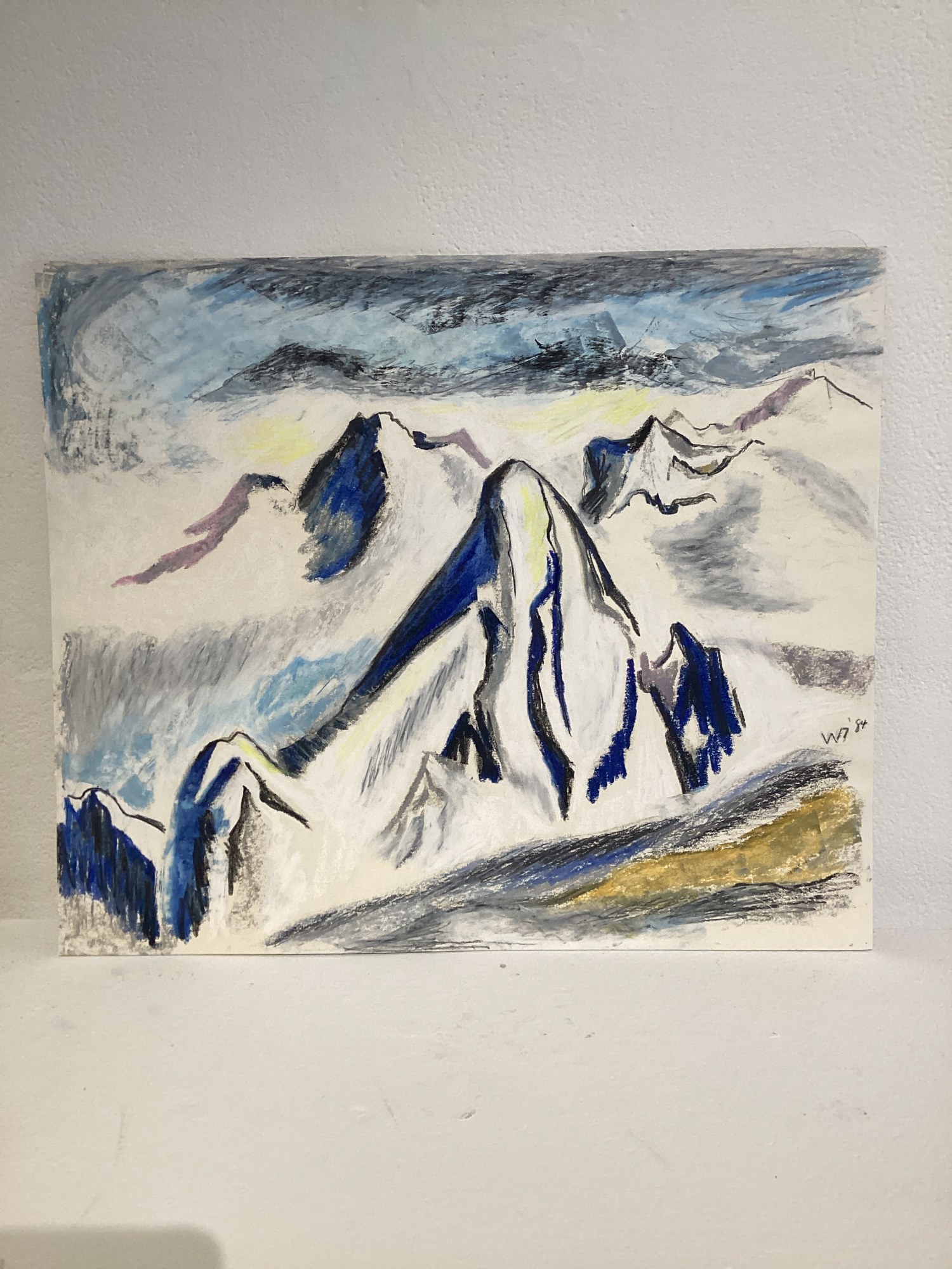 Olympic Mountains in white, colbalt, light blue and pink pastels.