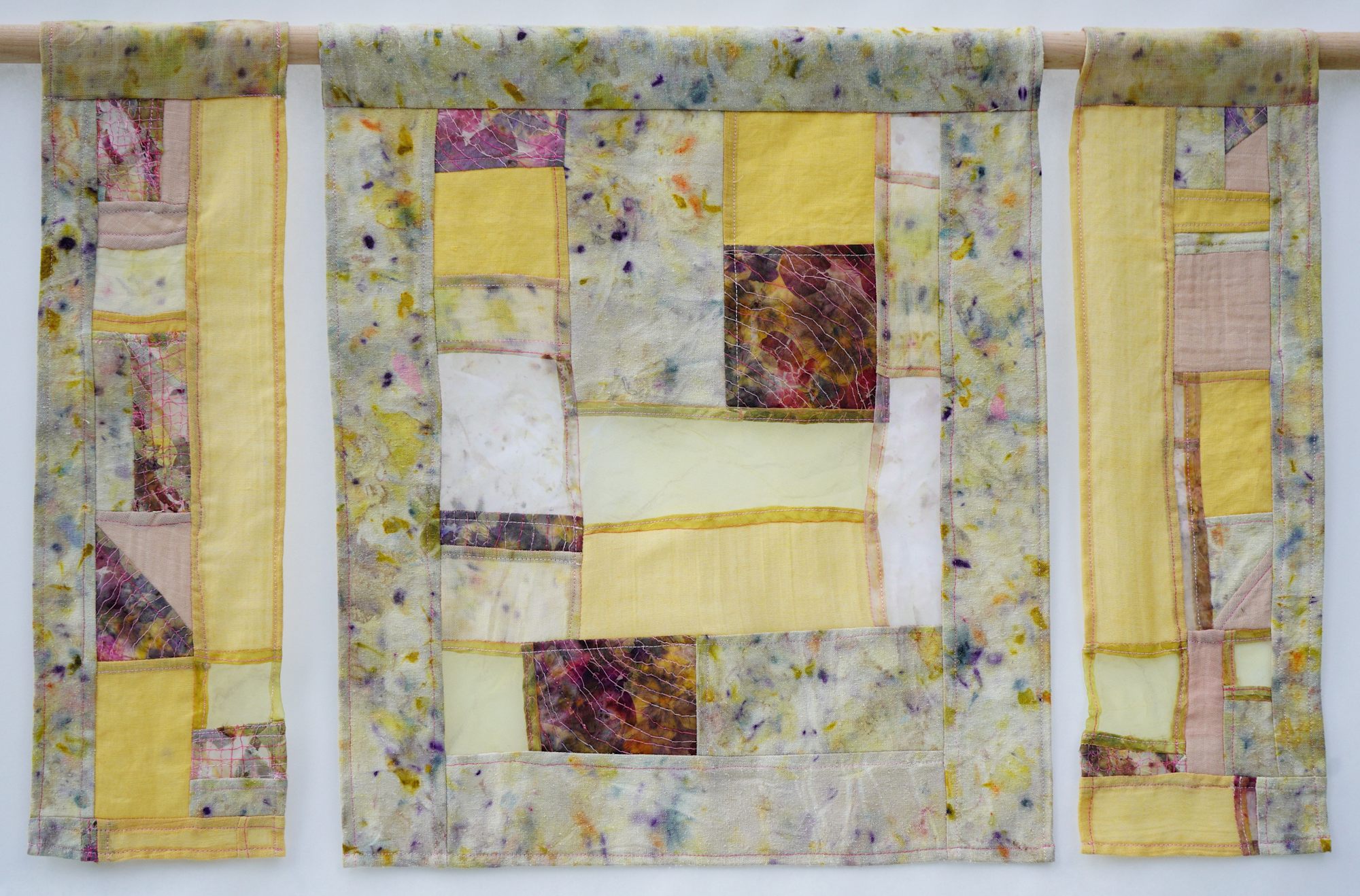 - Dried viola petals, black eyed Susan flower heads, dahlia petals, marigold petals, logwood chips, hydrangea petals, ferrous sulfate as a modifier, raw silk, silk organza, polyester organza, wool gauze, cotton curtain liner, embroidery thread
