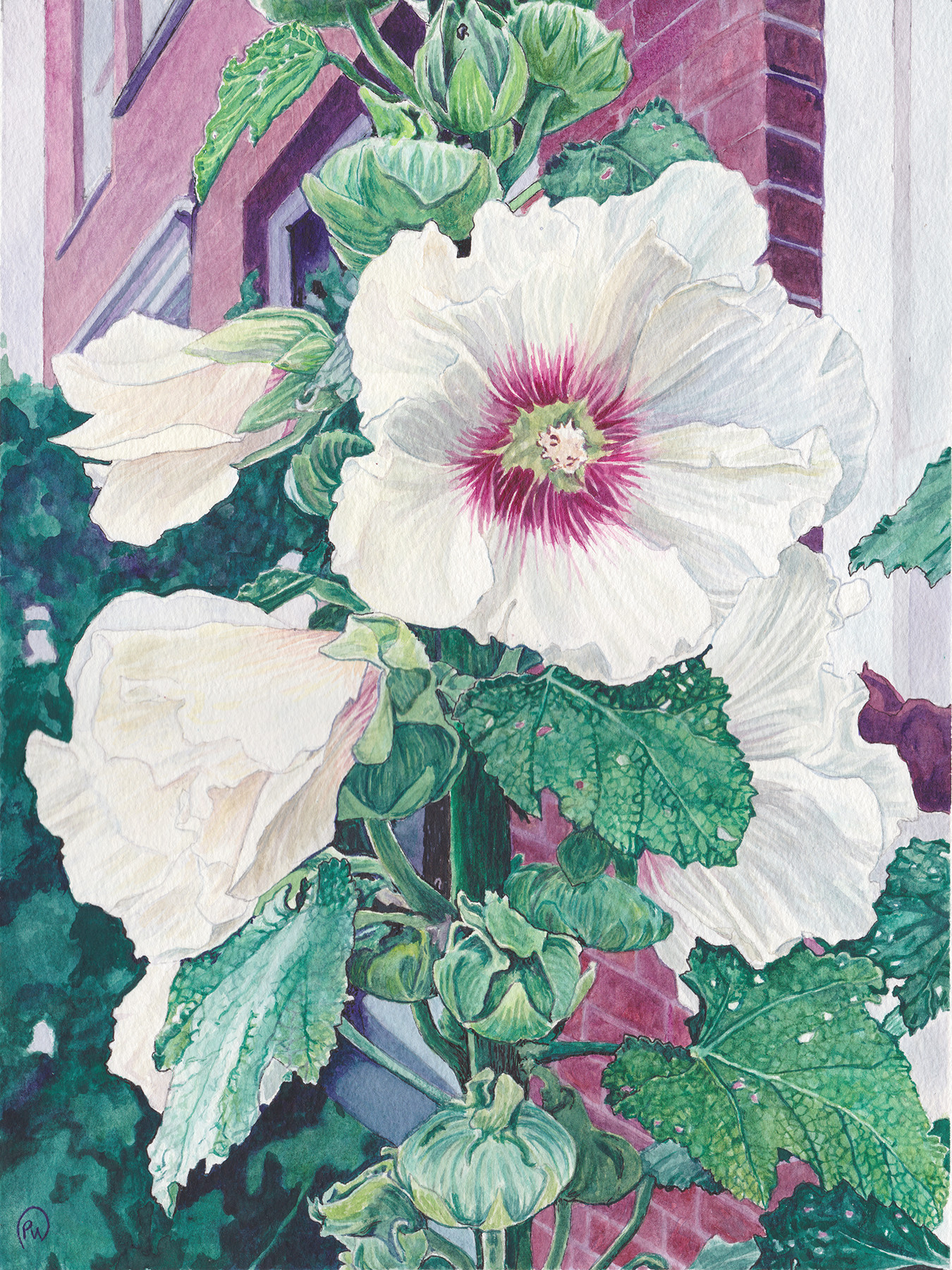 First in a series of watercolors depicting some of the stunning hollyhock blooms I saw during a visit to Amsterdam.