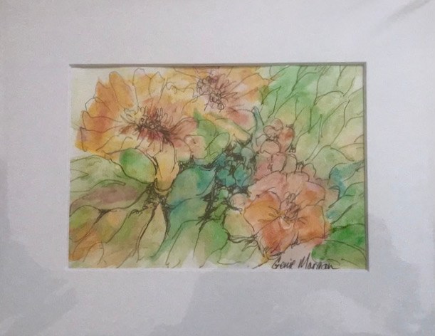 A loose watercolor with pen drawing expresses the soft presence in flowers. This piece is matted only.