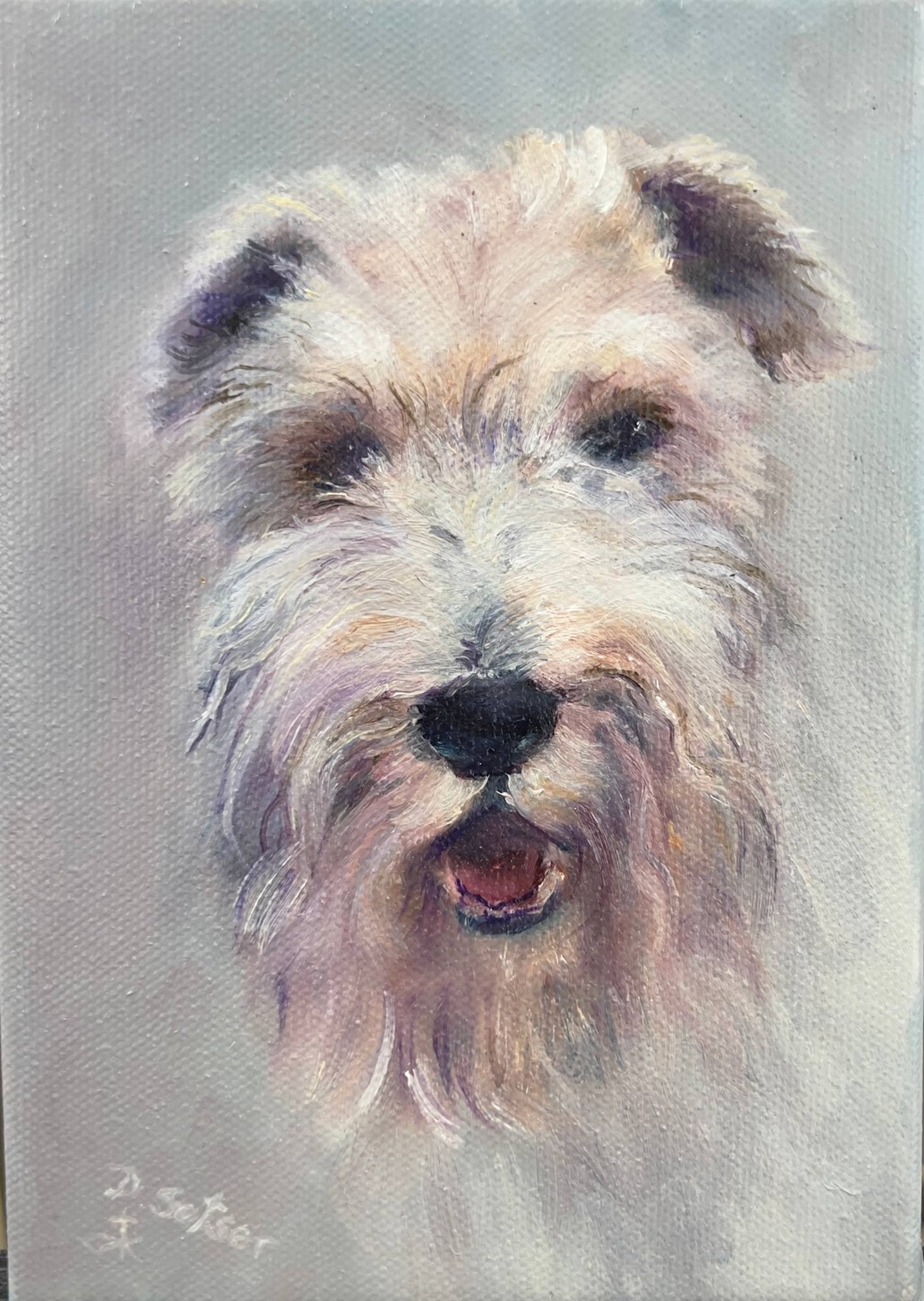 Presenting "Amelia, a Furry Muse," a captivating 5"x7" oil on canvas that beautifully encapsulates the spirited essence of Amelia, a Wire Fox Terrier brimming with charm. This vibrant pet portrait exudes joy and affection, reflecting the artist's profound love for dogs. Each brushstroke is imbued with playful energy and heartfelt emotion, bringing Amelia's lively nature vividly to life. Its compact, intimate size beckons you to connect more closely, evoking a warm and delightful feeling. Painted with extra love, "Amelia, a Furry Muse" is not just a visual delight but also a touching tribute to one exceptionally special pup.