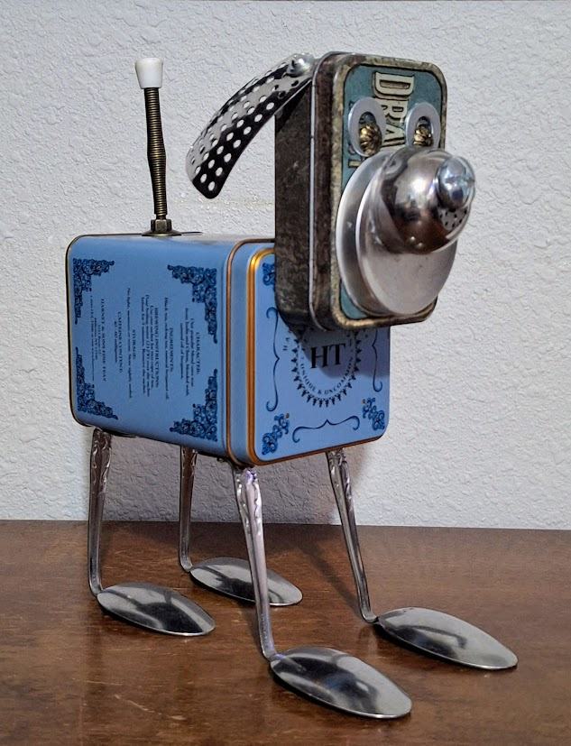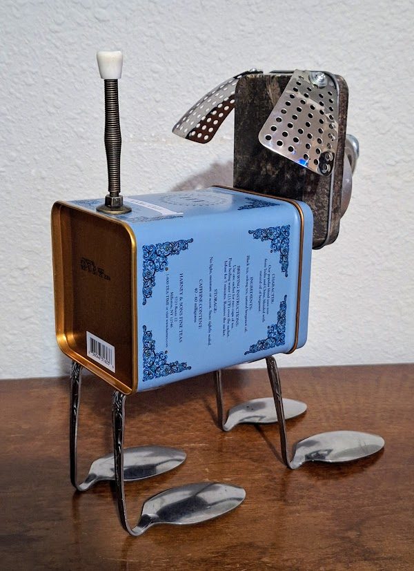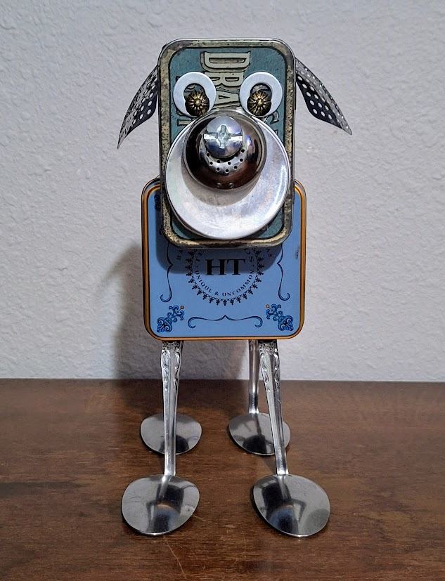 The artwork is a whimsical sculpture combining various metal and tin components to form a stylized dog. The body is a blue rectangular tin standing on four legs made from bent metal spoons, which serve as its feet. The head is constructed from a rectangular tin, and a bolt placed on the front, resembling a snout or nose. The ears are made from pieces of a disassembled steamer basket. The overall piece showcases creativity in repurposing everyday objects to fabricate a playful and imaginative representation of a dog.