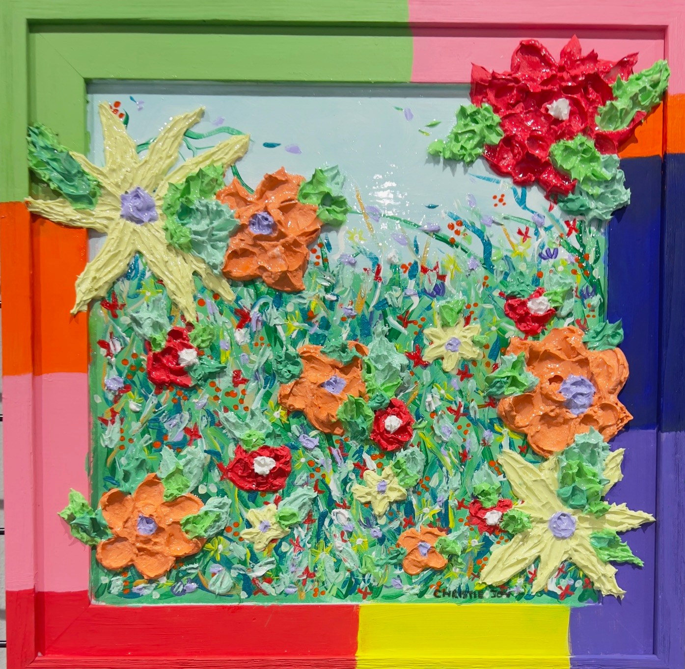Notice Me! This painting is demure in it's subject matter but it refuses to be ignored! The painting extends its color palette onto the surrounding wood frame. I went out of the box on this one. The textural flowers and the paint on the frame make this anything but your ordinary flower art. I know you will love this piece.