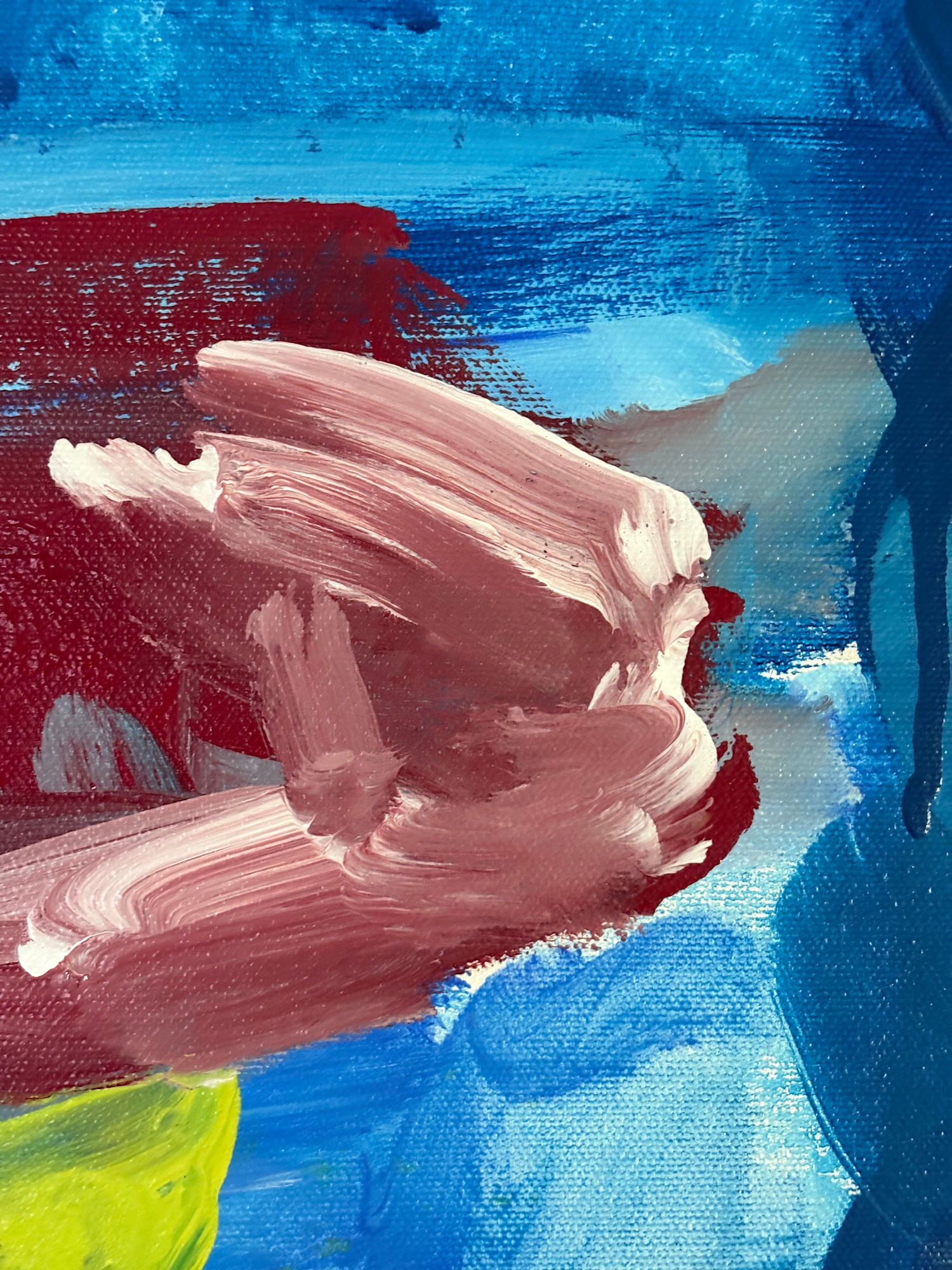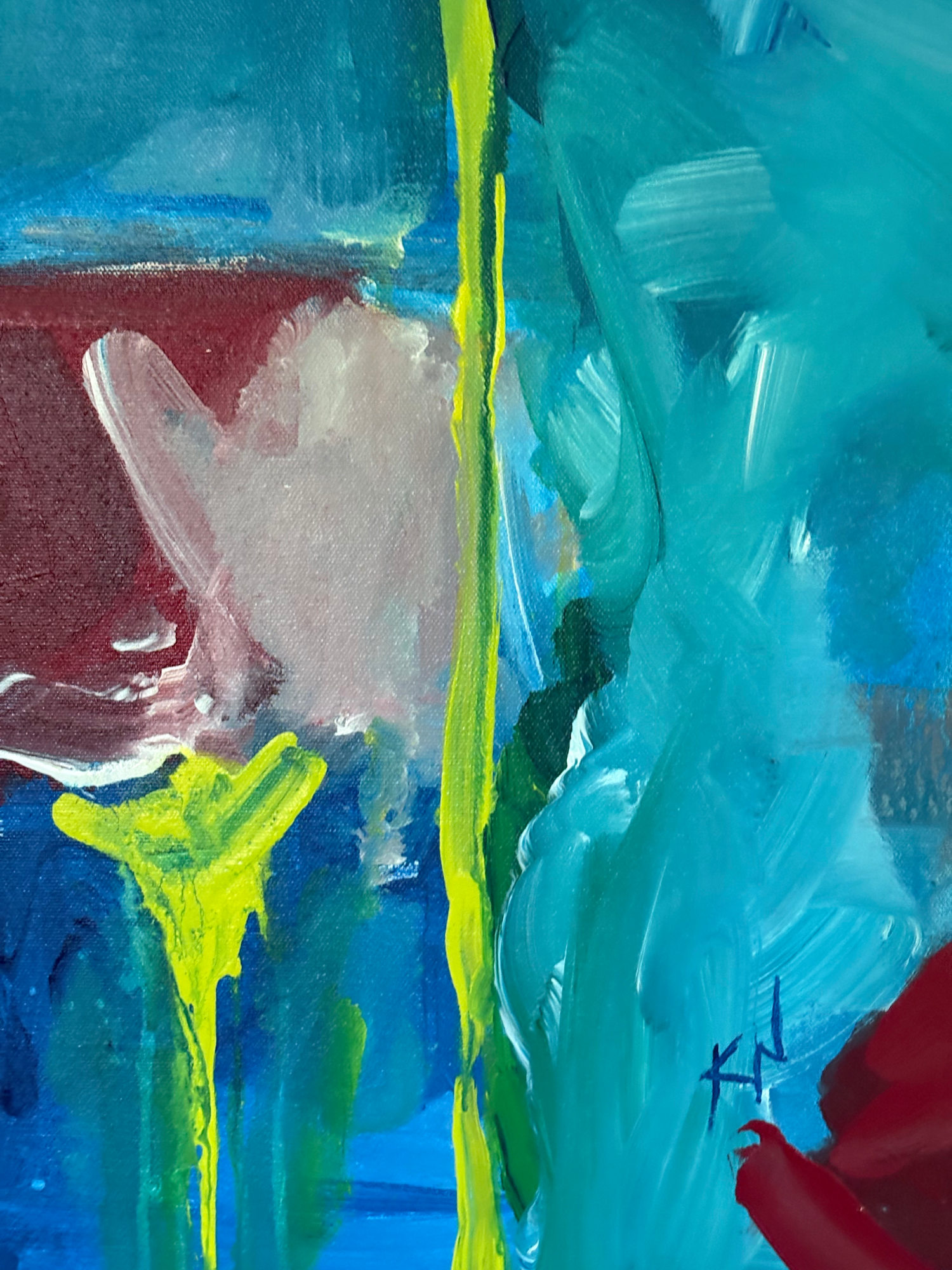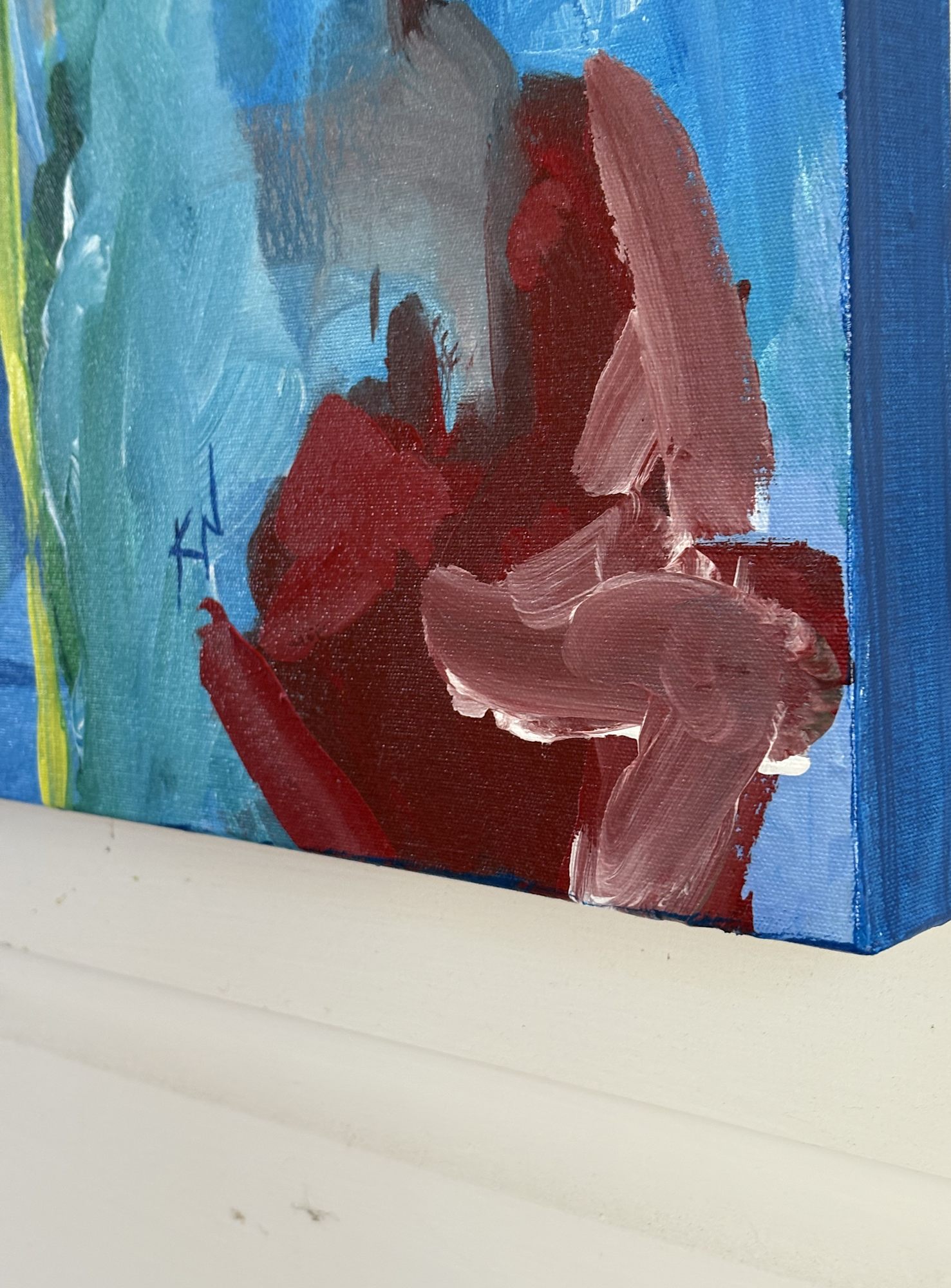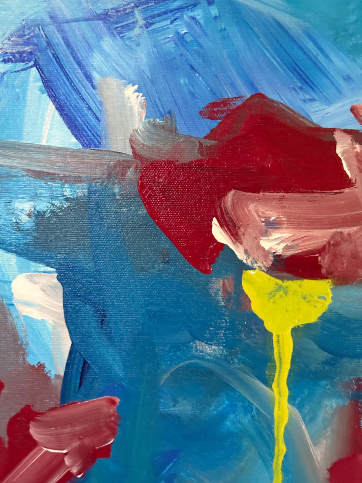 Crimson blossoms rise out of a cool, shifting field of blues, their forms suggested more by gesture than detail. The bright yellow drips that anchor each bloom feel like traces of movement—memories stretching downward, as if time itself has left its mark on the canvas. Rather than depicting a literal garden, the painting captures the sensation of one remembered: fleeting, luminous, and slightly out of reach.