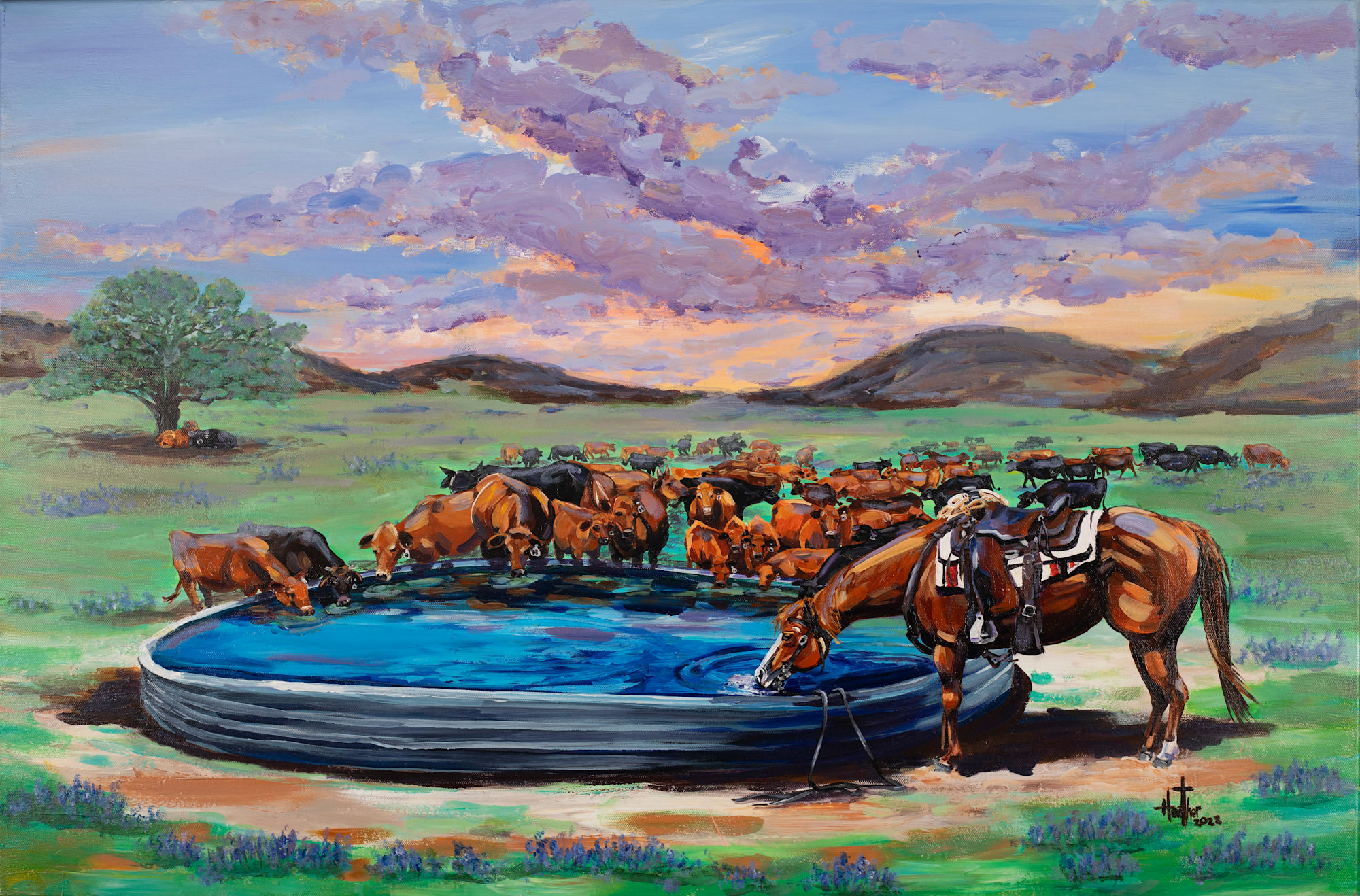 A hard days working cattle, letting your best mount have a drink along with his herd and the beautiful hill country in Texas
