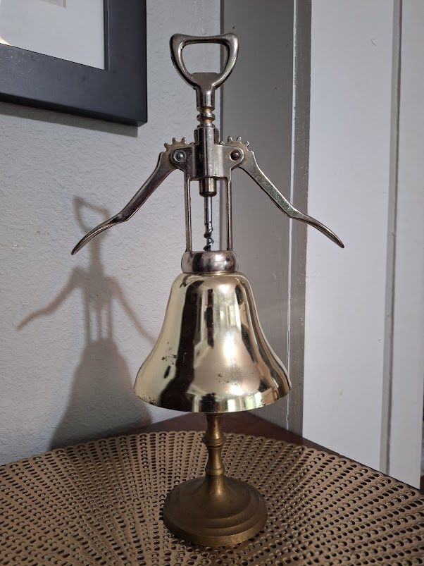The artwork is a sculptural piece combining an antique corkscrew mechanism with a brass bell. The corkscrew's handle and levers extend horizontally, giving the impression of dancing. Below the corkscrew, a brass bell with a polished, reflective surface is mounted on a slender, decorative brass stand. The overall composition merges functional elements from different objects into a cohesive artistic form, blending utilitarian design with sculptural elegance.
