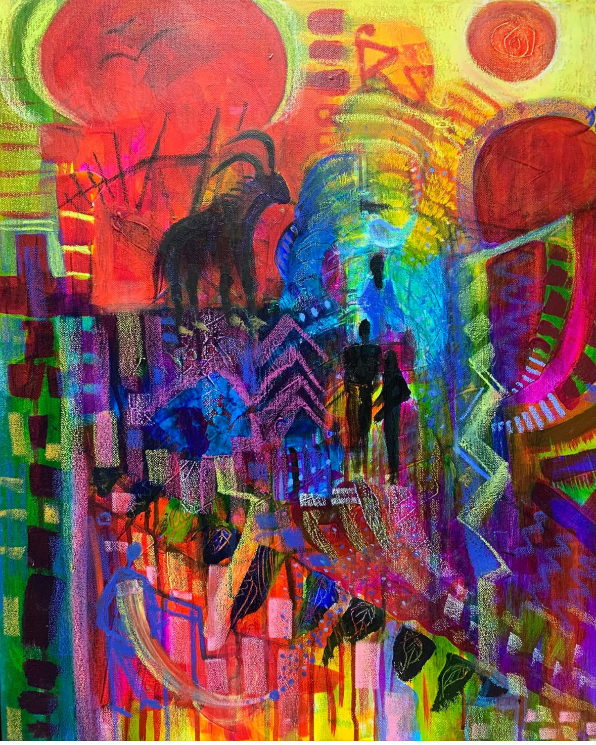 Whether through struggles or triumphs, every journey we take echos a shared desire to grow, evolve, adapt and reach our full potential. This abstract painting captures the essence of a journey both physical and metaphorical. A lone goat stands on the heights, symbolizing perseverance, strength and triumph. Below, three figures move forward, their path intertwines with the goat’s ascent. Are they chasing the same summit or are they following their own course? We are all climbing together yet apart, each of us foraging our own ascent while being part of something larger.