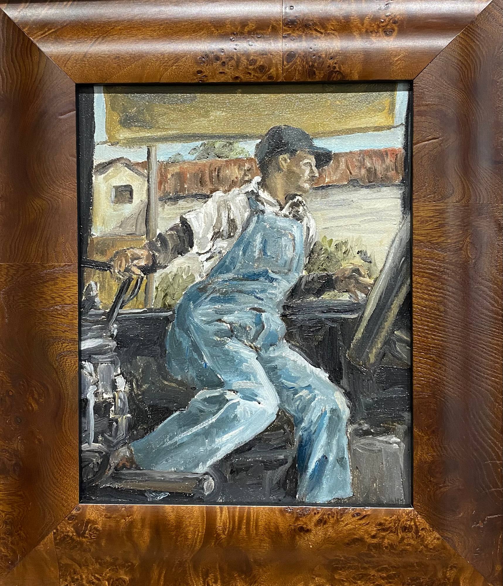 A vintage steam train engineer looks out the window with his hand on a control lever.