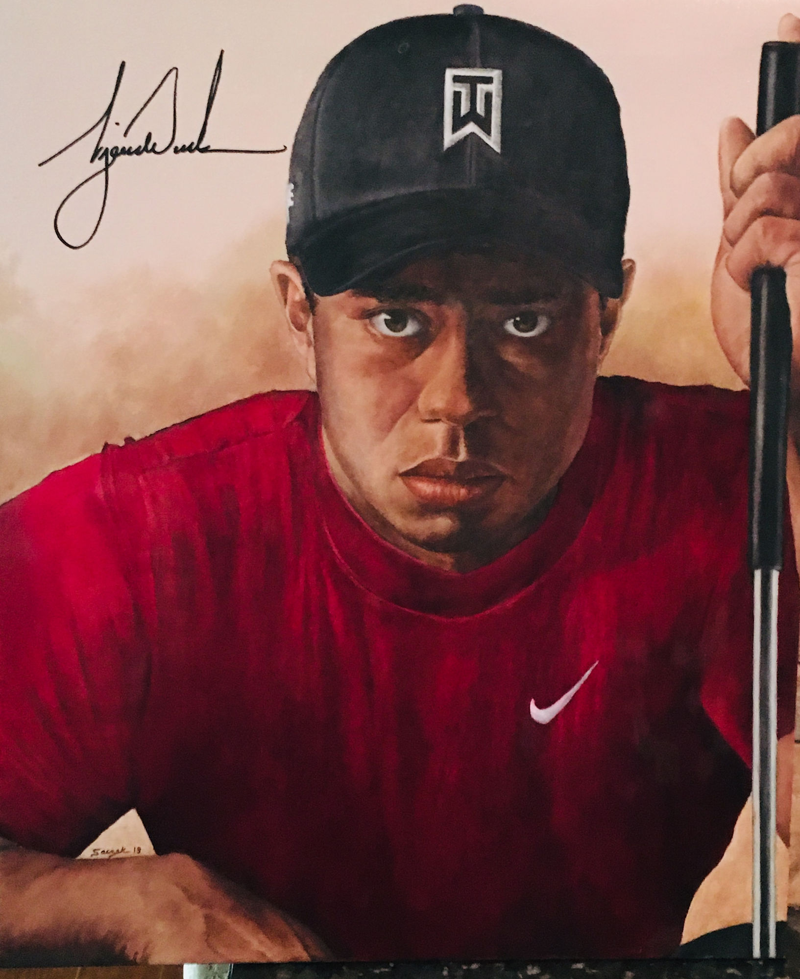 Tiger Woods, original art signed by Tiger Woods and artist. Authenticated by Upper Deck Authenticated (UDA).