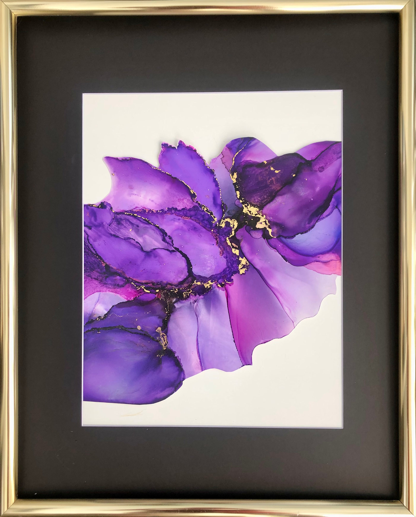 Abstract purple rocks with gold embellishments running through the ink. Signed on back.