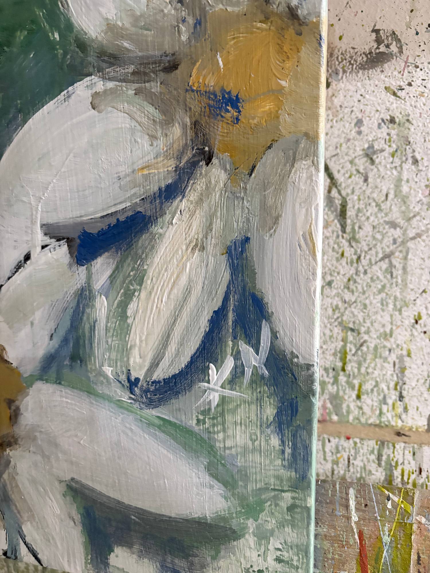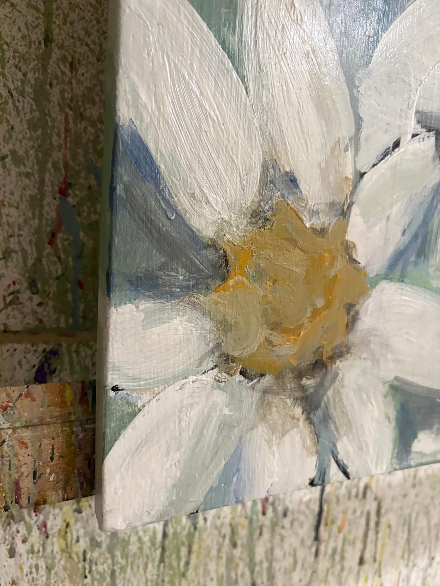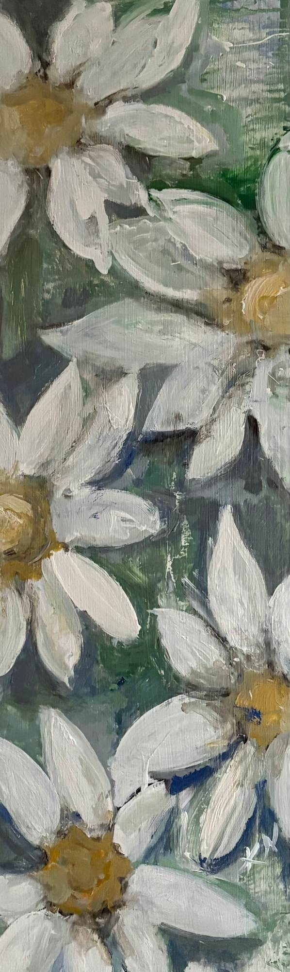A wise woman said to me, "the outer work is an expression of the internal struggle." Daisies are a symbol of friendships, so I painted them as an expression of my struggle with finding healthy friends. loosely orchestrated with a quick brush formulates this artwork. Using a soothing color palette can be seen as friendships should be a calming asset to one's life, not a harsh one.