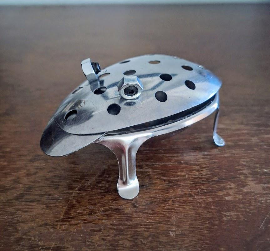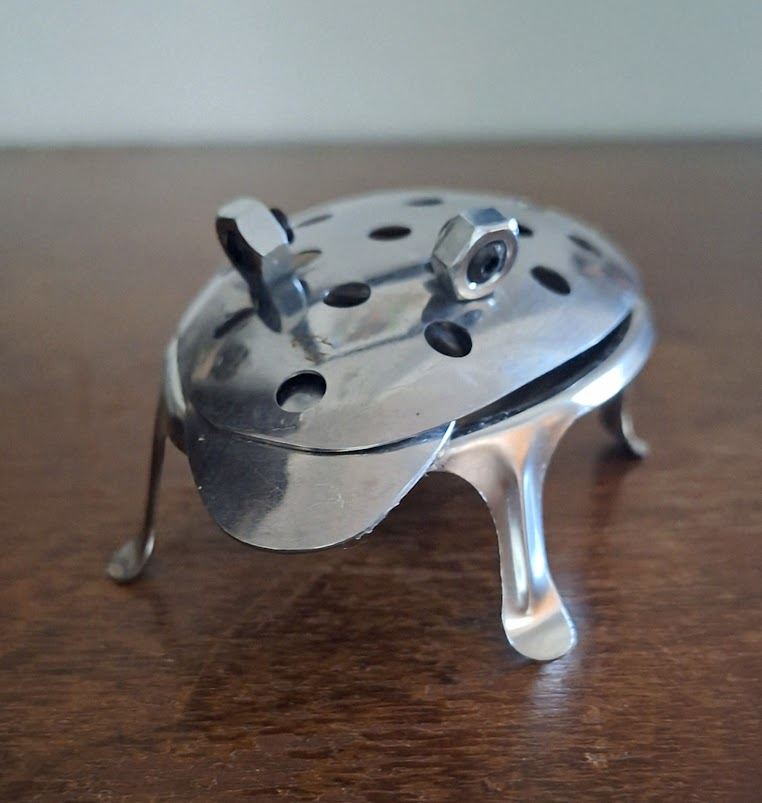 The artwork is a sculptural piece crafted from a skimmer spoon, egg dipper, table spoon, and bolt nuts, shaped in a sleek and polished form reminiscent of a frog. It features a rounded, slightly domed body with numerous circular perforations across its surface. The sculpture stands on four elegantly curved legs that elevate it above the surface, creating a sense of lightness. Two small metal nuts are attached on top, resembling eyes, adding character and a mechanical aesthetic to the piece. The overall design combines industrial materials with organic inspiration, highlighting smooth contours and reflective surfaces.