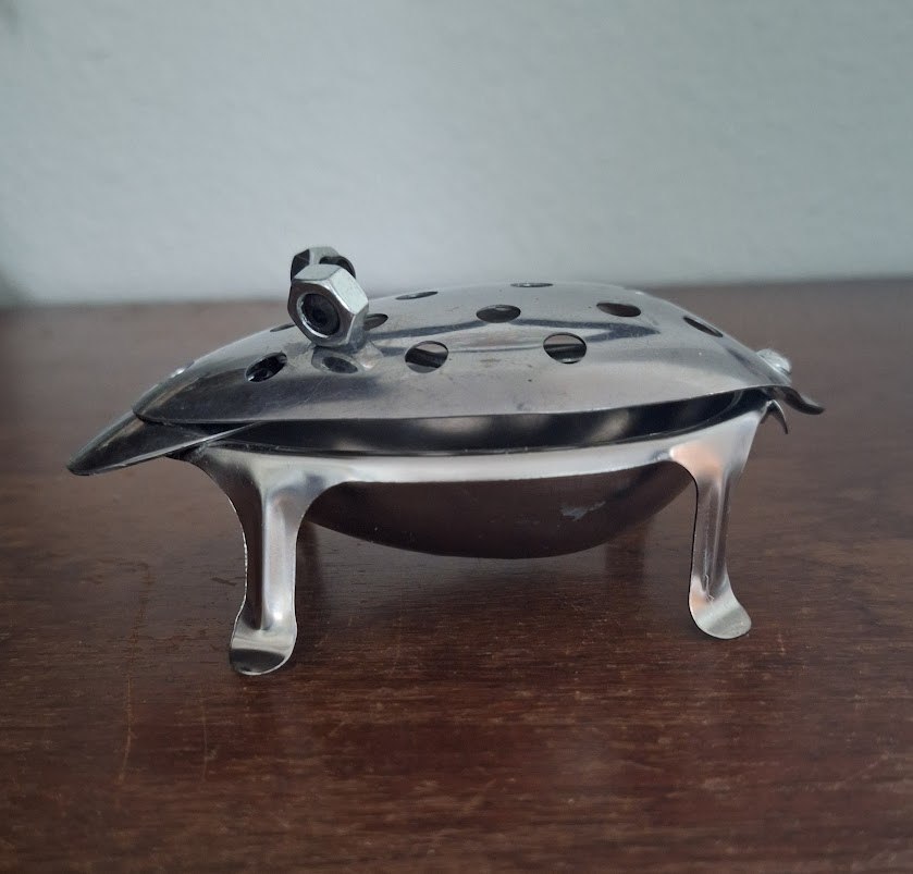 The artwork is a sculptural piece crafted from a skimmer spoon, egg dipper, table spoon, and bolt nuts, shaped in a sleek and polished form reminiscent of a frog. It features a rounded, slightly domed body with numerous circular perforations across its surface. The sculpture stands on four elegantly curved legs that elevate it above the surface, creating a sense of lightness. Two small metal nuts are attached on top, resembling eyes, adding character and a mechanical aesthetic to the piece. The overall design combines industrial materials with organic inspiration, highlighting smooth contours and reflective surfaces.