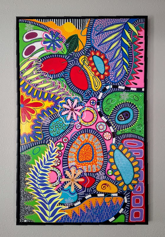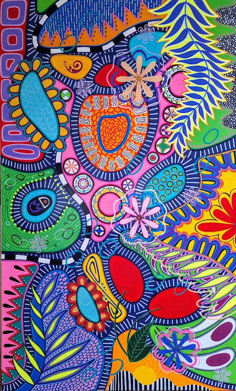 The artwork is a vibrant and dynamic abstract composition filled with an array of bold, vivid colors. It features a variety of organic and geometric shapes interwoven in an intricate pattern. There are multiple floral and leaf-like motifs, some outlined with thick black lines, creating a sense of depth and movement. The background contains alternating dark and light strokes that enhance the artwork's energetic and rhythmic quality. The piece conveys a lively, almost psychedelic sensation through its complex layering and striking color contrasts.