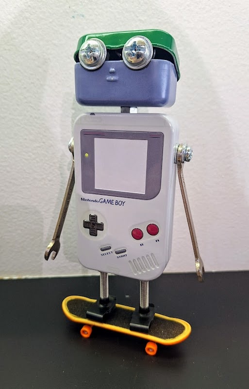 This fobot is a nostalgic piece made of a tin gameboy playfully balanced on a skateboard.