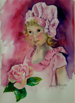 Young girl dressed in pink with a pink striped bonnet holding a pink rose.