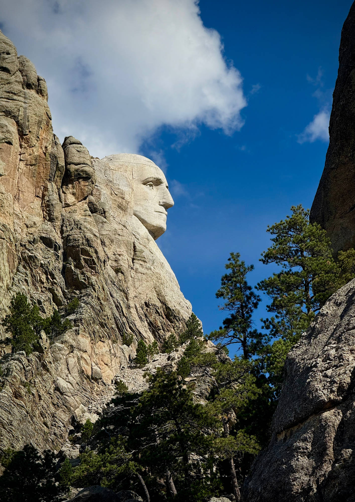 Unique shot of Mount Rushmore American Hero, George Washington side view