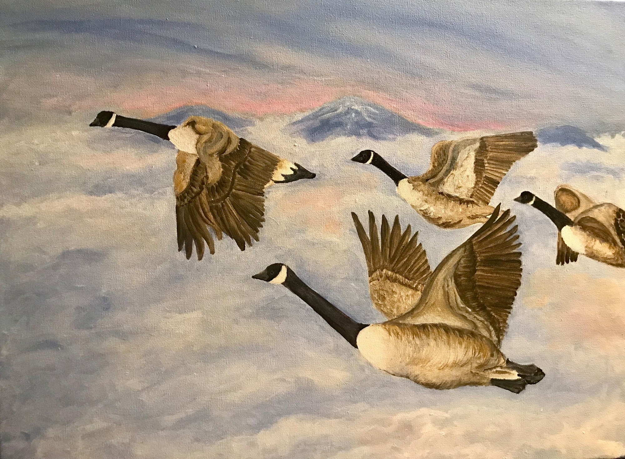 The other day, I heard the honking of geese and looked up just in time to see about 20 Canadian geese soaring low, right over my house. In this painting, I imagine myself flying with them, high above the stunning Colorado mountains where I once lived. We're gliding through the clouds, like I’ve seen so many times from a plane, and I'm always amazed by the colors up there—colors you can’t catch from the ground. When I look at this piece, it brings me a sense of peace, and I hope it does the same for others.