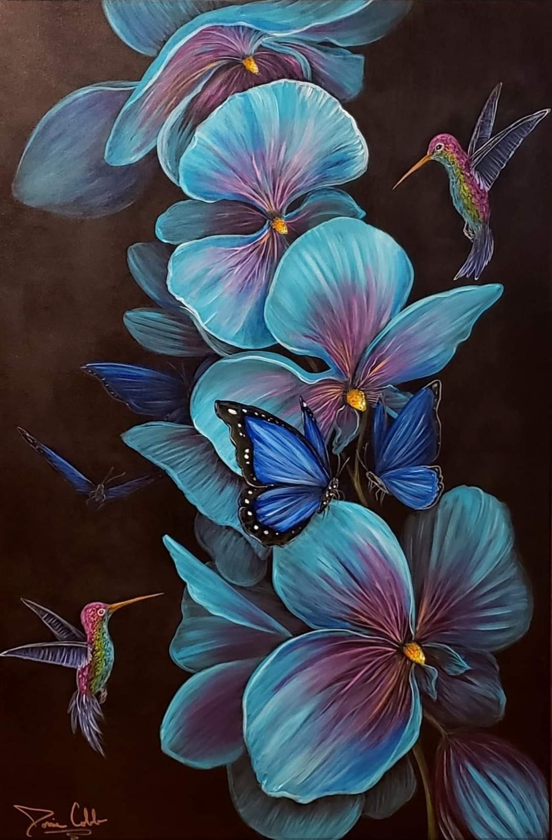 This lovely piece full of contrast. Dark background with deep blues, and turquoise gor the orchids and precious little hummingbirds singing their sweet songs around them.