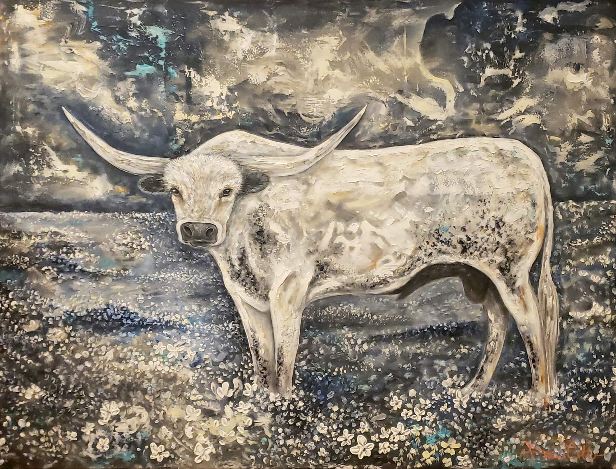 This textured rustic piece measures 36x48 on stretched canvas. It is done in deep hues of blues, greys, with hints of turquoise and gold accents.