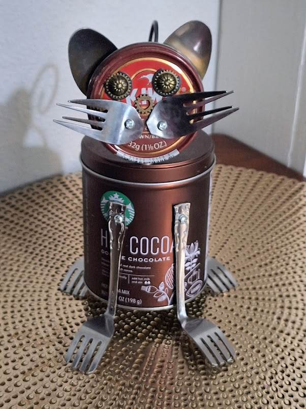 The artwork is a creative sculpture of a cat made from household items. The cat's body is a brown metal tin labeled "Hot Cocoa," and its head is formed from a shoe polish tin. The ears are made from two metallic spoons positioned upright. The eyes are constructed from two ornate metal gears, and the cat's whiskers are represented by two metal forks arranged horizontally on each side of the face. The legs and feet are also crafted from forks, with the handles attached to the tin body and the tines pointing downward to form the paws.