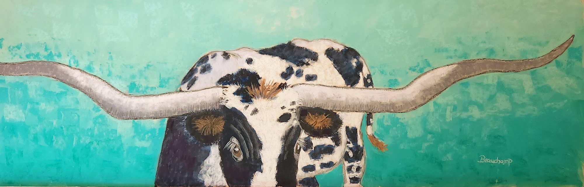 Black & White Longhorn with long horns. Won 1st Prize Professional Animals division at PORAL show in 2024