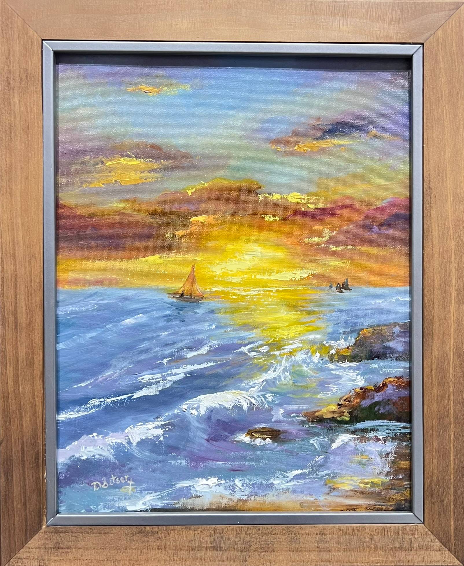 "Maritime Glow" is a captivating 11x14-inch oil on canvas that beautifully portrays a sunset seascape. The vibrant blend of oranges, yellows, and purples fills the sky, reflecting off calm waters. Energetic waves crash against rocky outcrops, while a solitary sailboat glides through, embodying both tranquility and adventure. The artwork captures the interplay of light and sea, evoking a serene yet lively maritime scene. Inspired by a love for the ocean, its elegant simplicity and rich colors make it a standout for any viewer.