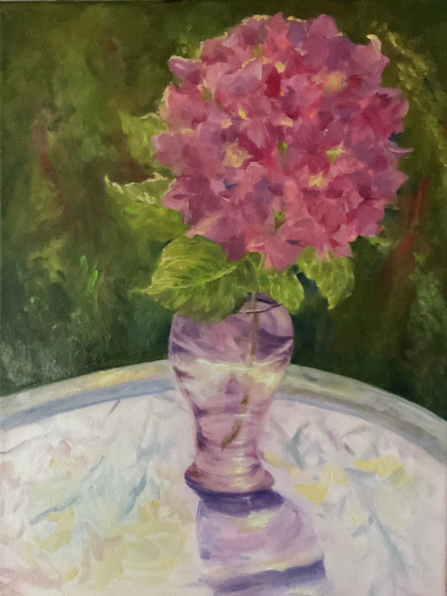 Giclee print of the original oil painting. The artwork is a painting of a single hydrangea with vibrant pink petals arranged in a bouquet. It is placed in a translucent, purple-hued vase. The composition rests on a light-colored table, casting a soft shadow, and the background is a blend of green tones, suggesting foliage or an outdoor setting. The style is impressionistic, with visible brushstrokes adding texture and depth.
