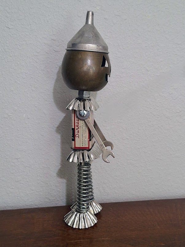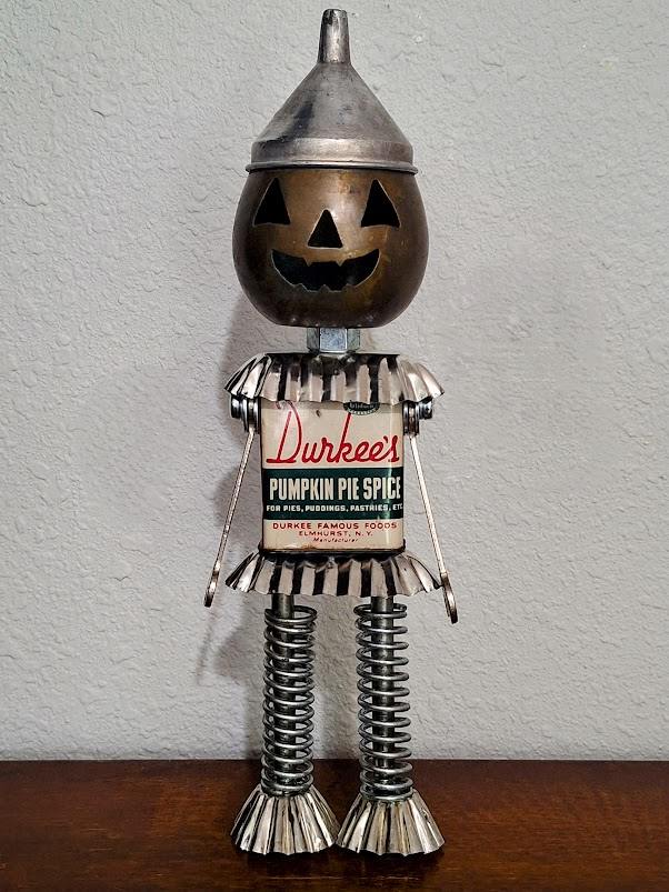 The artwork is a whimsical sculpture combining vintage and industrial elements. The head is a metal jack-o'-lantern with traditional triangular eyes, a nose, and a toothy smile. The body is made from an old Durkee's Pumpkin Pie Spice tin, complete with the original label. The arms are small wrenches ending in simple hand shapes, and the legs consist of coiled metal springs with flared, tart tin feet. The sculpture has a playful, retro aesthetic, blending seasonal Halloween imagery with repurposed household items.