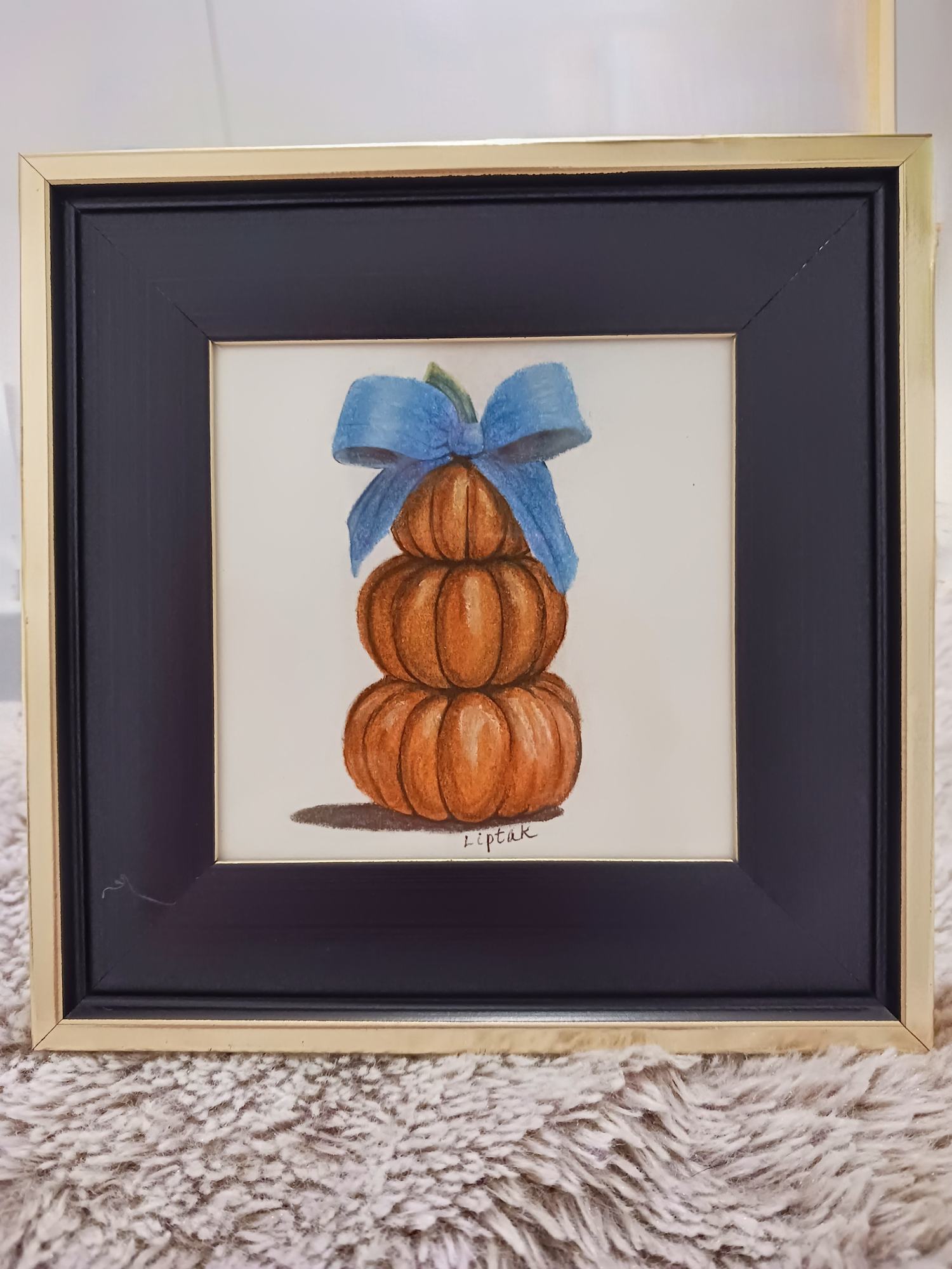 A happy stack of pumpkins wrapped up with a bow to celebrate fall. This piece is a 3.5x3.5 pastel drawing framed in a 6.25x6.25 tabletop frame. (No wire hanger)