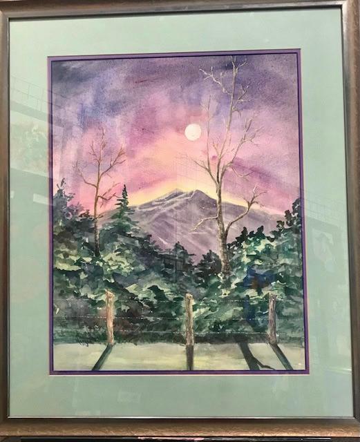 The painting transports the viewer to a serene mountain setting in Colorado, where the sun sets in a spectacular display of colors, casting a warm glow across the landscape. In striking contrast, the moon rises, its silvery light adding an ethereal quality to the scene. The trees, bathed in a soft haze of color, frame the composition beautifully, while the majestic Mount Yale looms in the distance, illuminated by the fading light. This artwork invites the imagination to wander through the tranquil surroundings, evoking a sense of peace and wonder. One can almost hear the gentle rustle of leaves and the distant call of wildlife, while the interplay of light and shadow encourages contemplation of the beauty that nature offers.